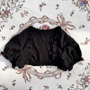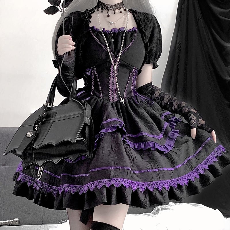 深みのあるブラックをベースに、神秘的なパープルのフリルやリボンを効かせた、ダークファンタジーな雰囲気漂うゴスロリセットアップです。