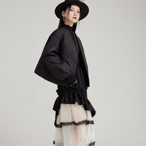 マットな質感のブラック生地に、細やかなダイヤ柄のキルティングを施した中綿入りのジャケットです。