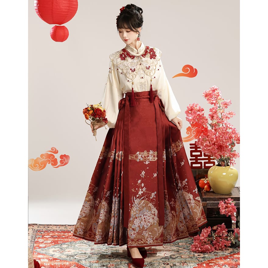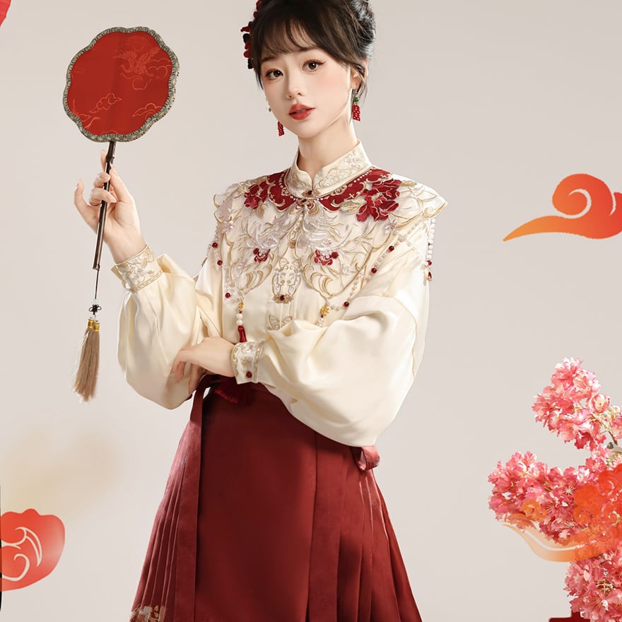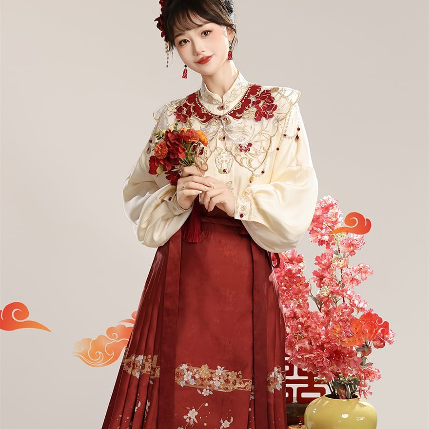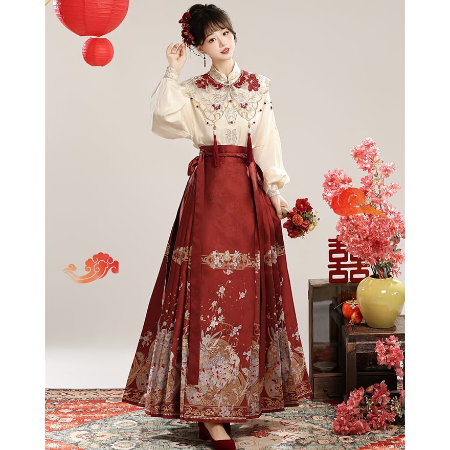 上品なクリーム色の立ち襟トップスに、深紅のプリーツラップスカート、そして繊細な刺繍が施された付け襟がセットになった、漢服スタイルの豪華な中華ロリィタです。