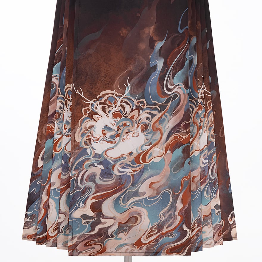 トップスにはチャイナボタンや精緻な柄があしらわれ、スカートは敦煌の壁画を思わせるような神秘的なグラデーションカラーが特徴的。