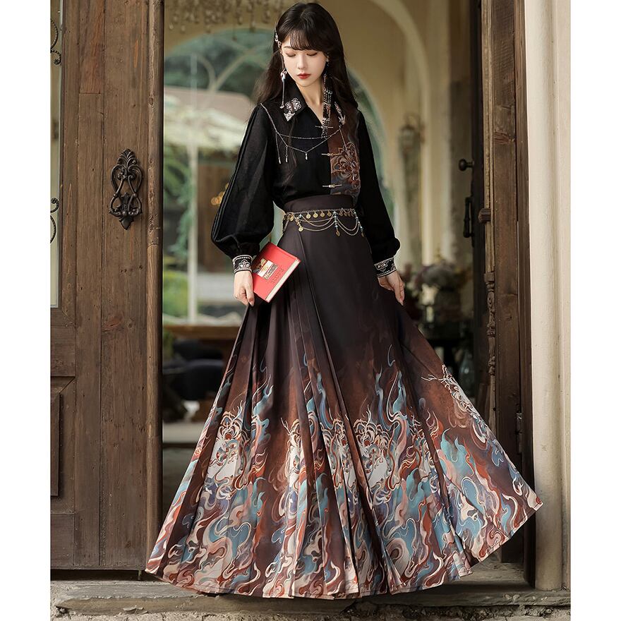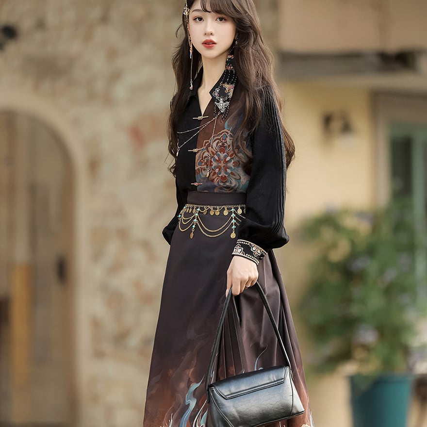 アシンメトリーな切り替えデザインが個性的な黒のトップスと、伝統的な雲炎模様がドラマチックに描かれたロングスカートのセットアップです。