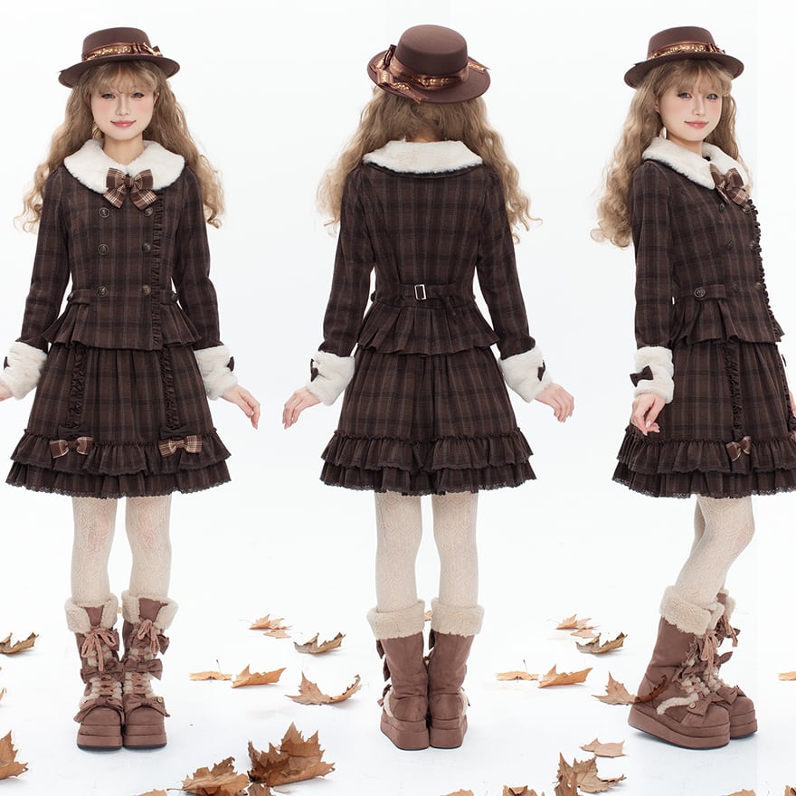 こっくりとしたチョコレートカラーのチェック柄に、真っ白なファーの襟と袖口が映える、ジャケットとミニスカートのセットアップです。