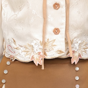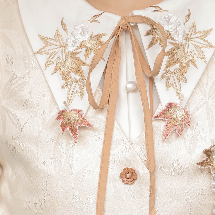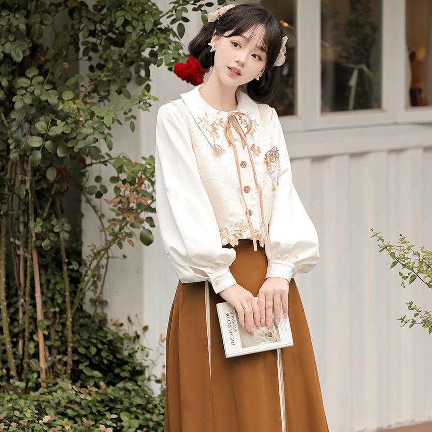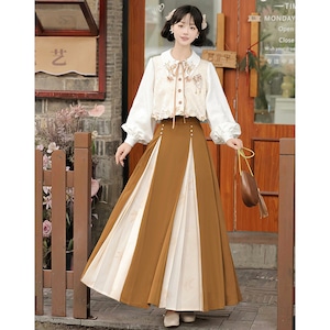 上品でクラシカルな雰囲気を纏う、ベスト、長袖シャツ、ロングスカートの3点セットアップです。刺繍入りのベストとボリュームのあるスカートが特徴で、普段使いから特別な日まで幅広く活躍します。落ち着いたブラウンとベージュの色合いは、どんなシーンにも合わせやすく、大人の女性のエレガンスを引き立てます。様々な販売サイトで「漢服」や「チャイナ風」の要素を取り入れたデザインとしても人気の商品です。
