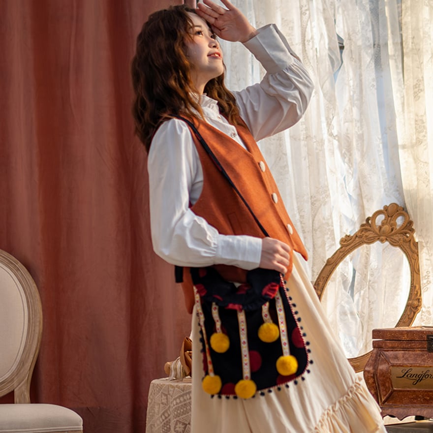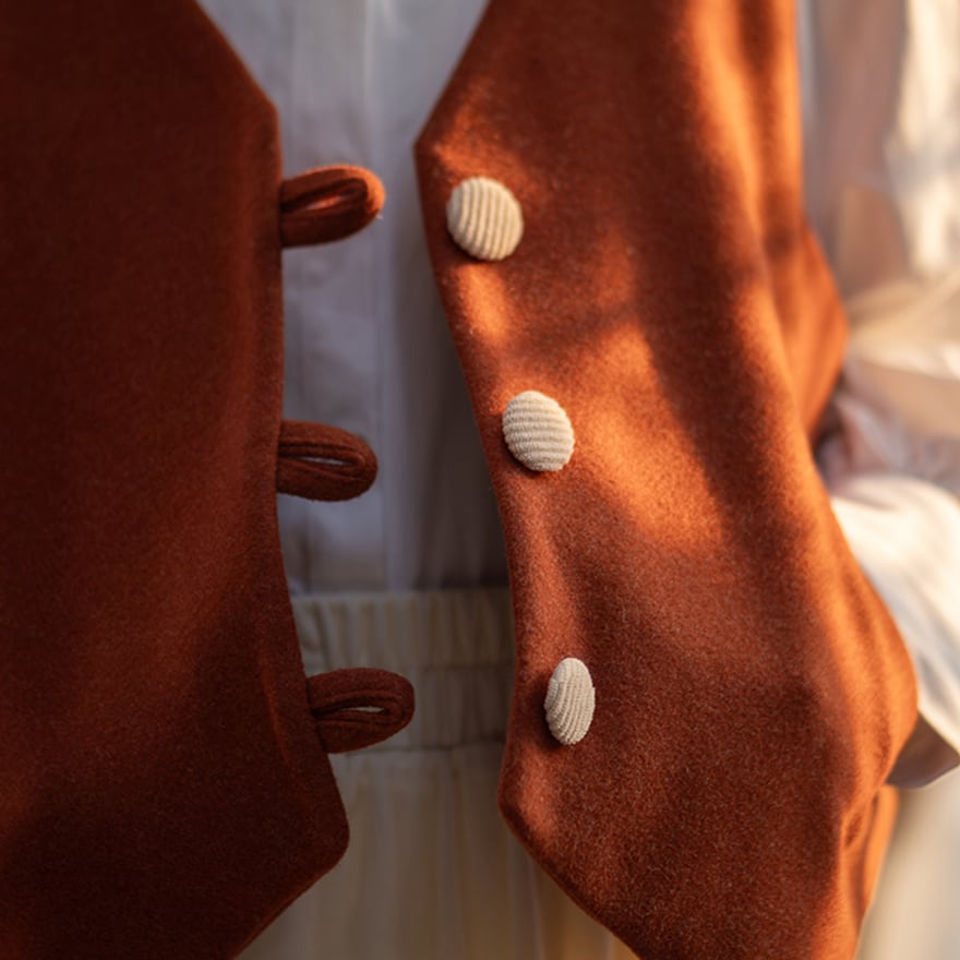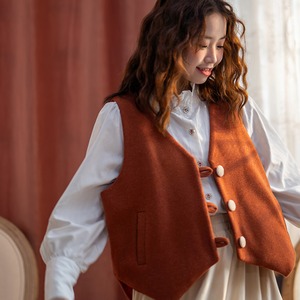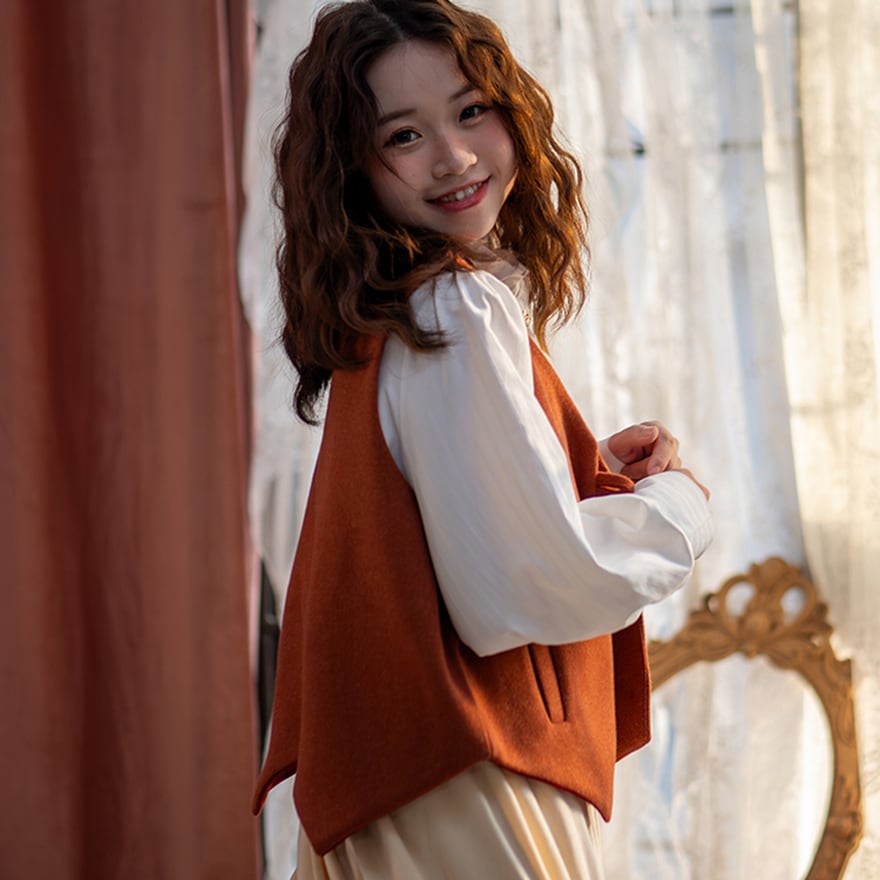温もりのあるウール調素材と、チャイナボタンのアクセントが目を引く主役級ベスト。丸みを帯びたヘムラインが、原宿系ストリートのレイヤードスタイルを格上げします。深みのあるテラコッタカラーは、白ブラウスやフリルスカートとも相性抜群。どこかノスタルジックで個性的な、唯一無二のサブカルスタイルを完成させます。