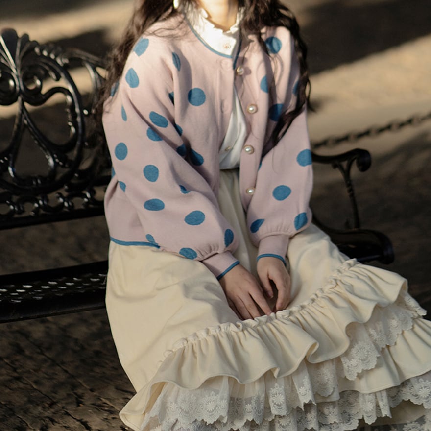 柔らかなクリーム色の生地をたっぷりと使い、幾重にも重なるフリルとレースがまるでデコレーションケーキのような愛らしさを演出するロングスカートです。