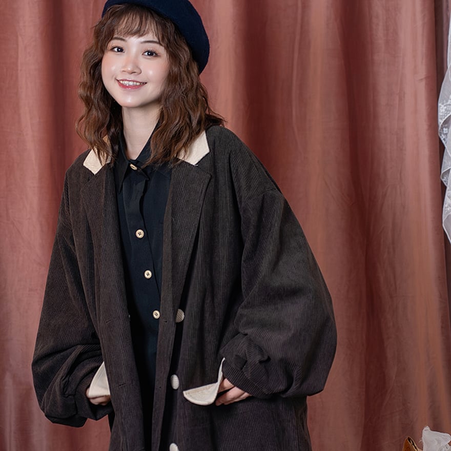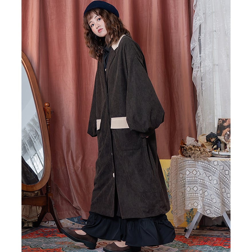 深みのあるダークブラウンのコーデュロイ生地に、襟とポケットのベージュが優しいアクセントになった、レトロでクラシカルな雰囲気のロングコートです。