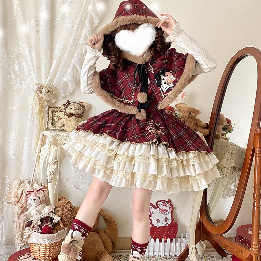 くま耳ケープ&赤チェックジャンパースカートセット ロリータ サブカル系【先行予約】