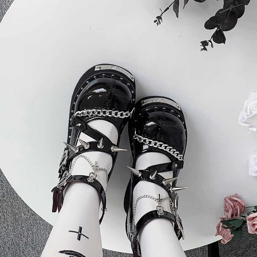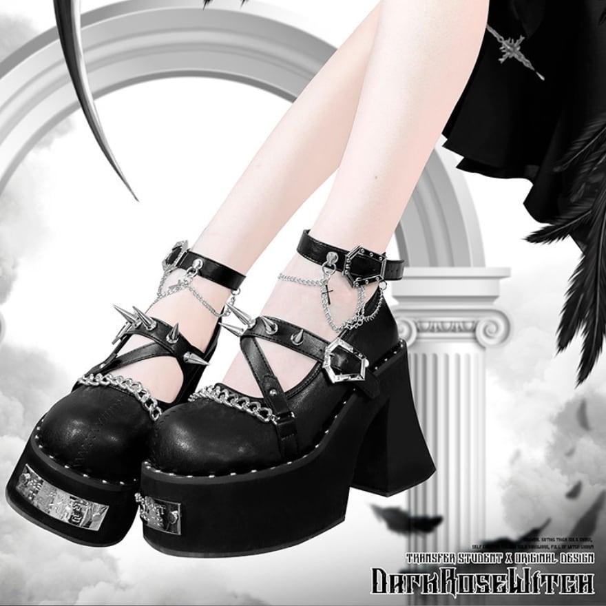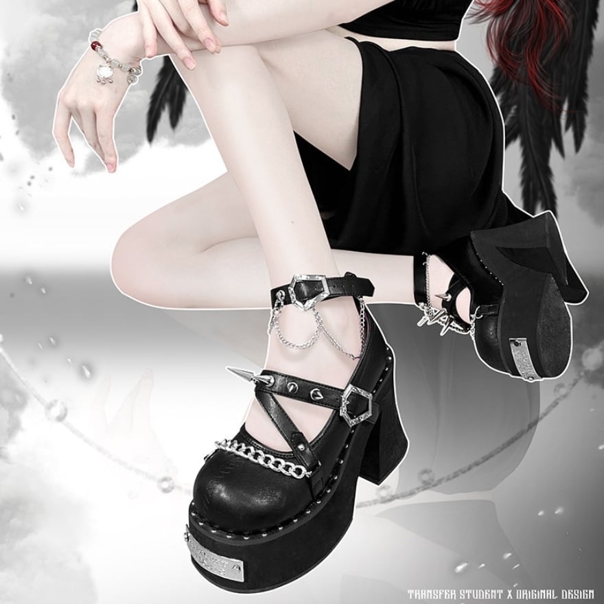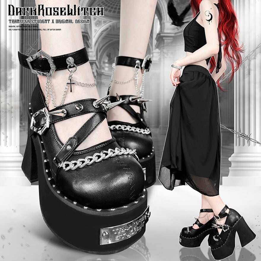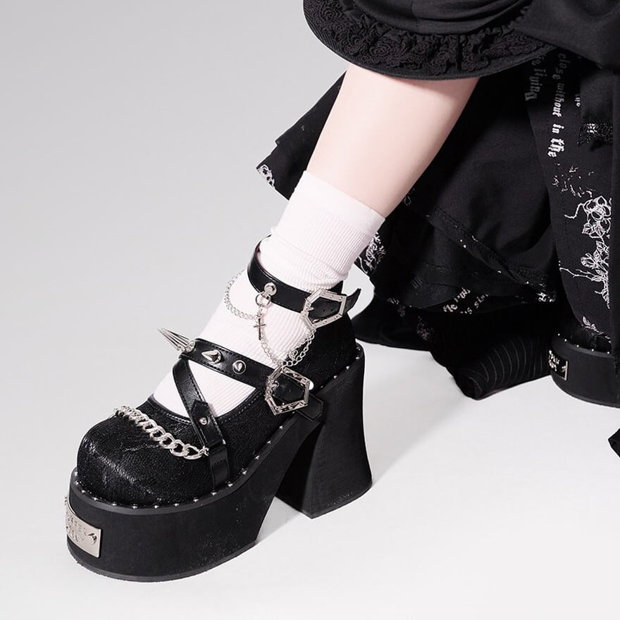 地雷系・ゴシック系サブカルファッションを好む方が、ライブ参戦やイベント、日常コーデで存在感を演出できるチェーン&スタッズ装飾付きの厚底ストラップシューズです。