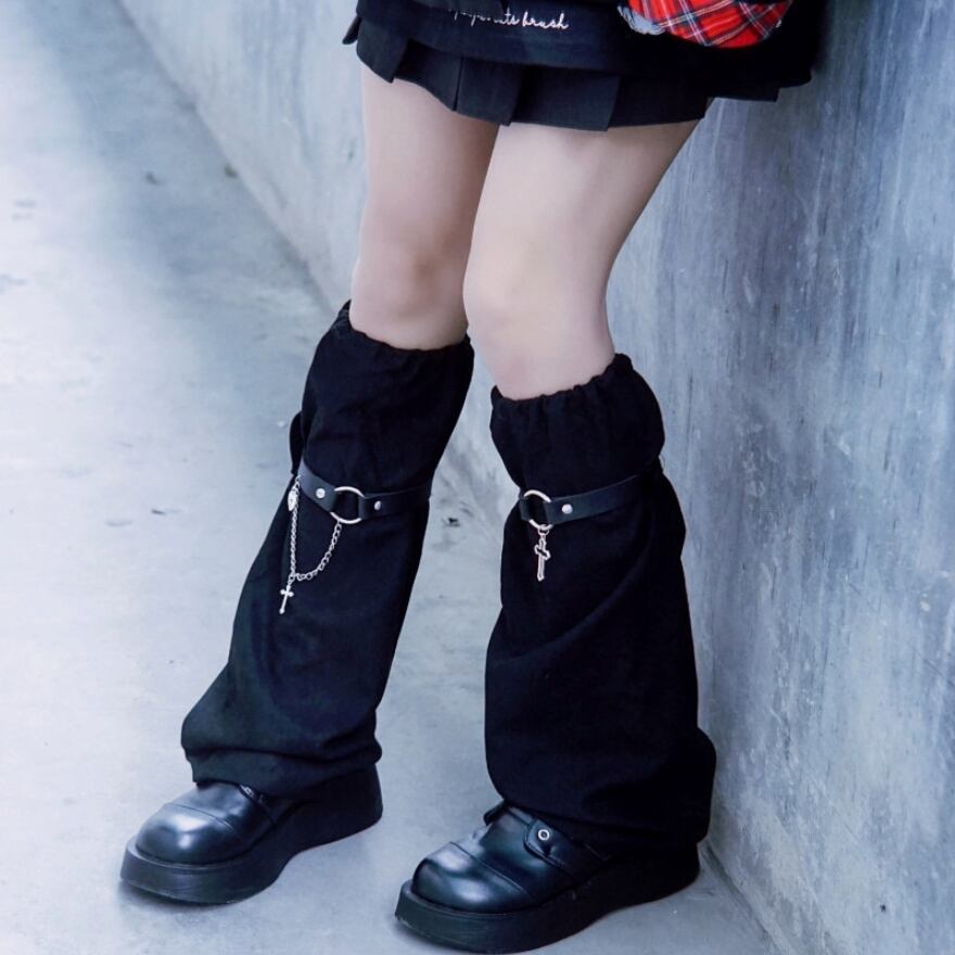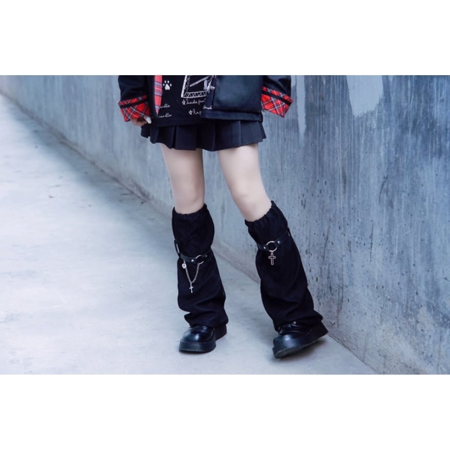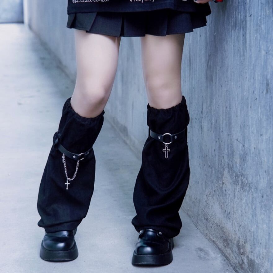 日常の地雷系・サブカルコーデに取り入れやすい、ゴシック調デザインのクロス装飾付きレッグカバーです。