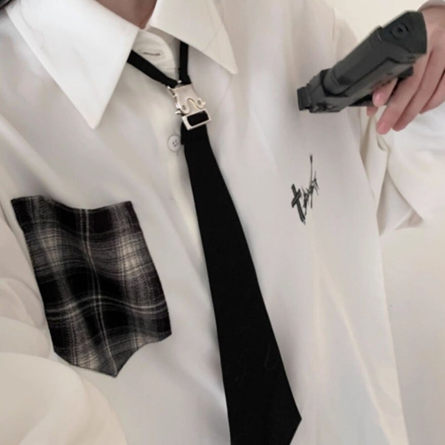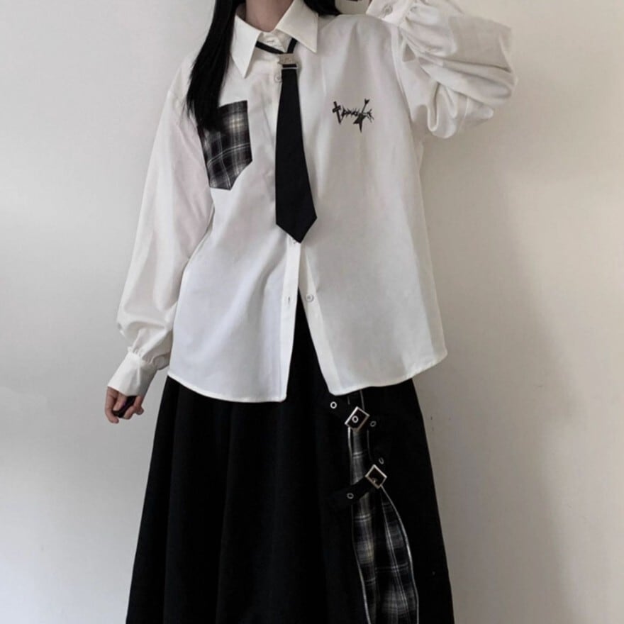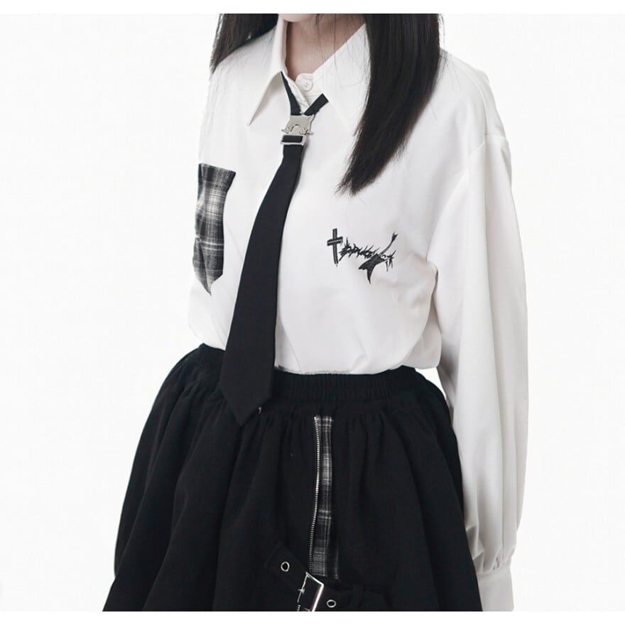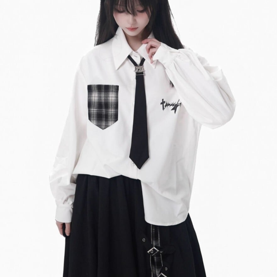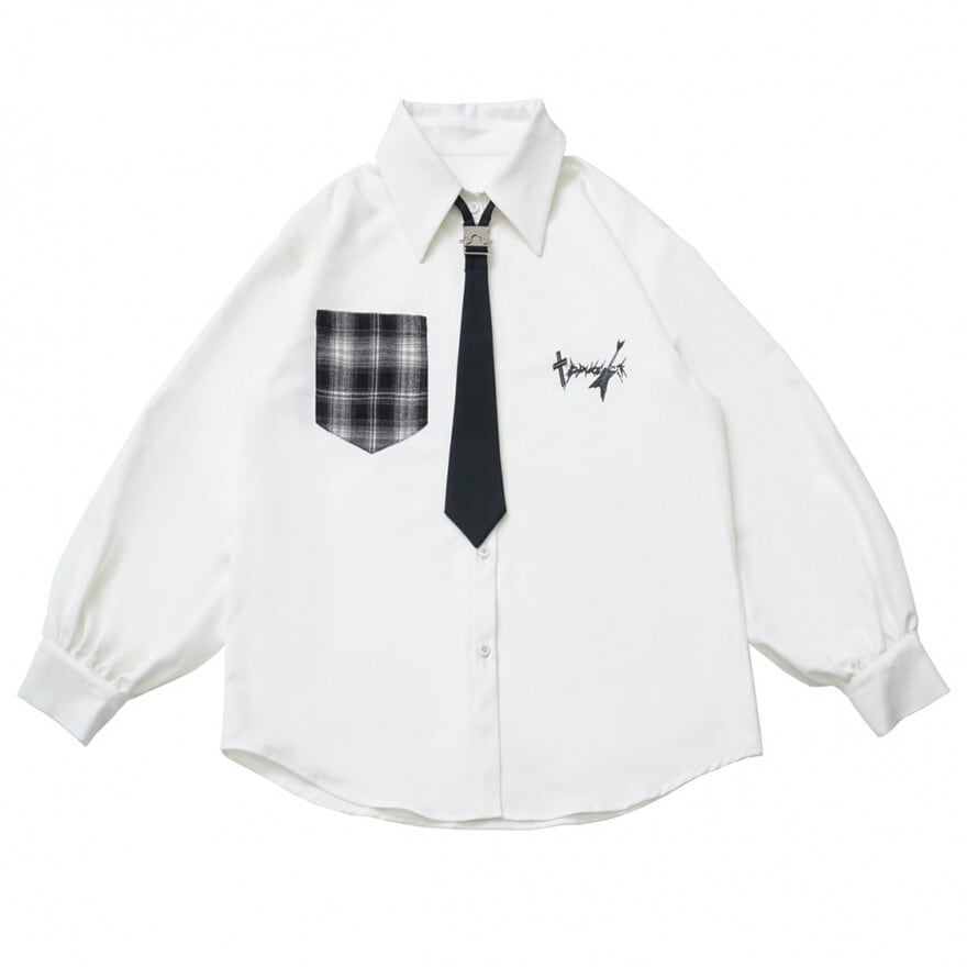 ホワイトの生地に、ブラックのネクタイとチェック柄ポケットがアクセントとなった、クラシカルロリータの長袖シャツです。