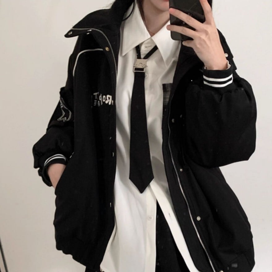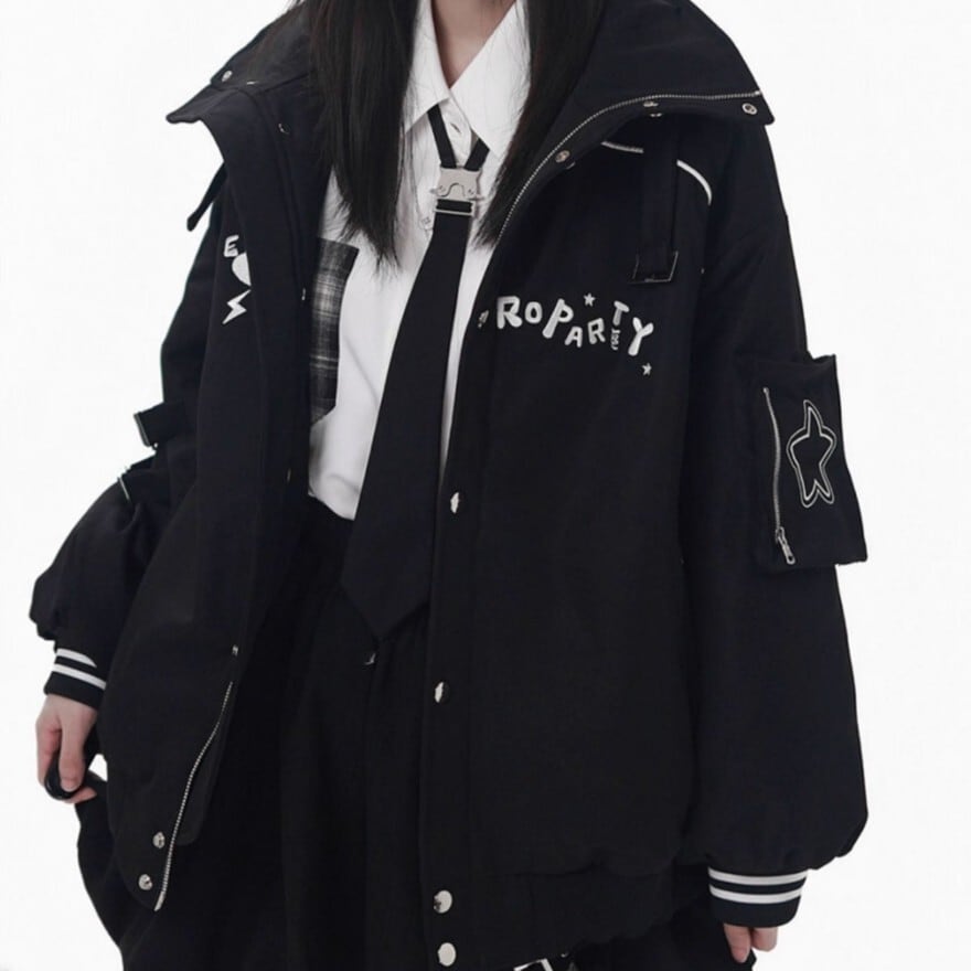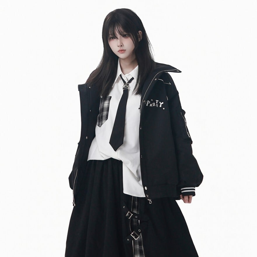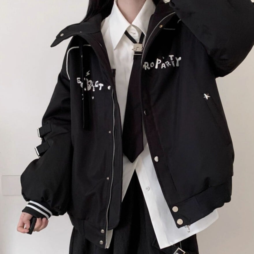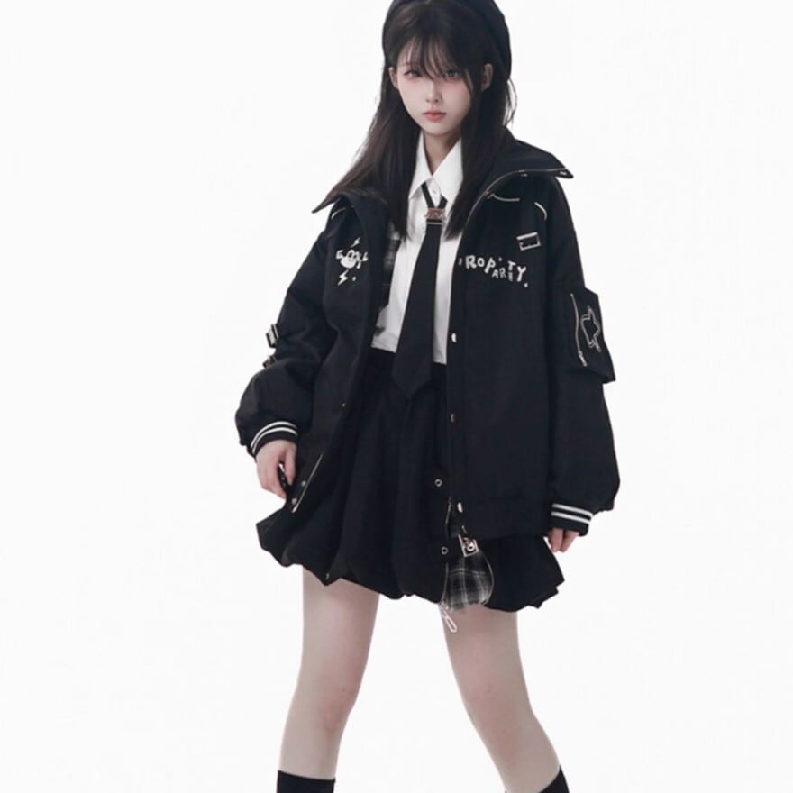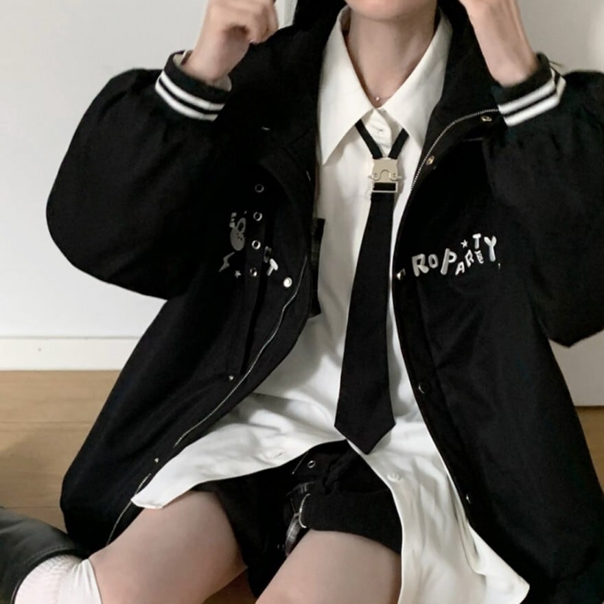 襟元のシャープなラインと胸元のロゴ風デザインが、モダンな印象を与えつつ、ロリータらしい可愛らしさも演出します。