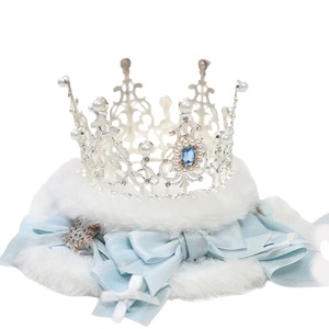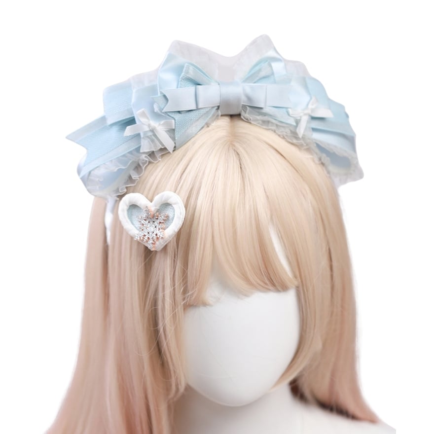 冬の「氷のプリンセス」をイメージした、柔らかなファーとアクアブルーのリボンが特徴的な、初心者でもクリップ一つで華やかに決まるロリータ用ミニハットです。