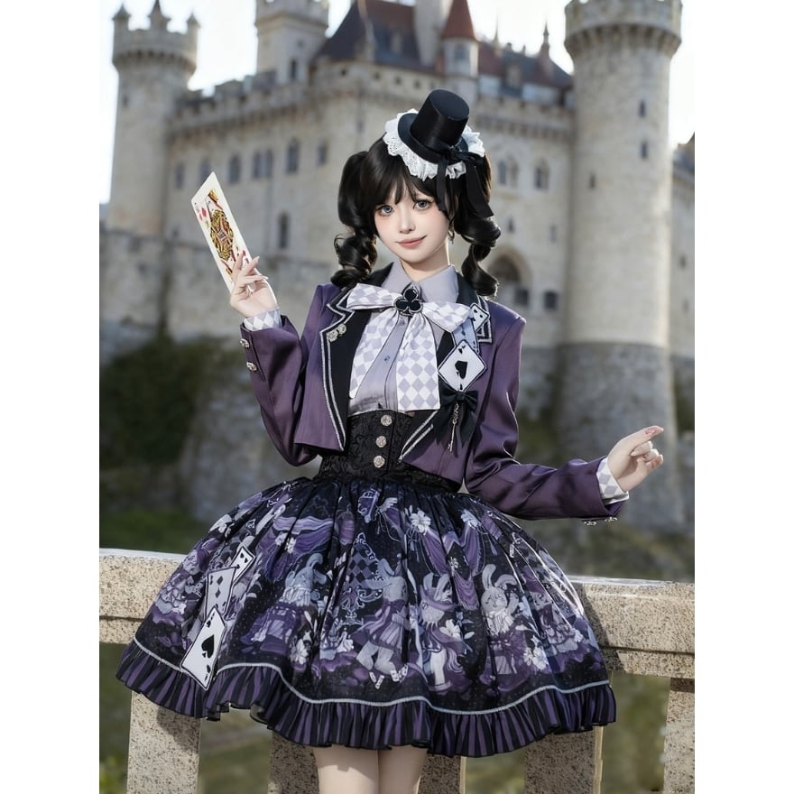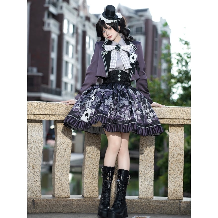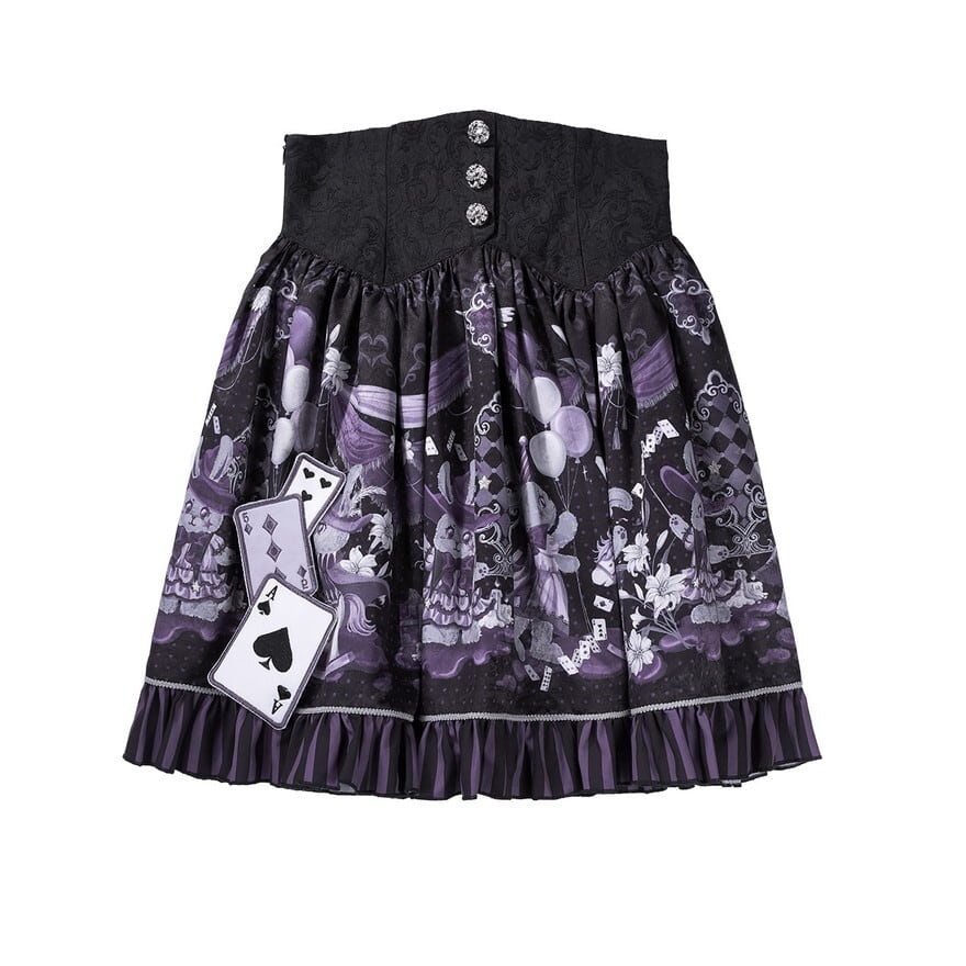 ・スカートはトランプ柄プリントとフリル裾で、物語性のある華やかさを表現