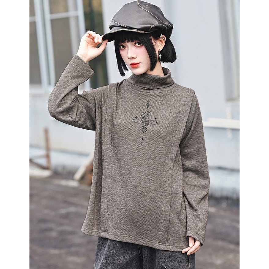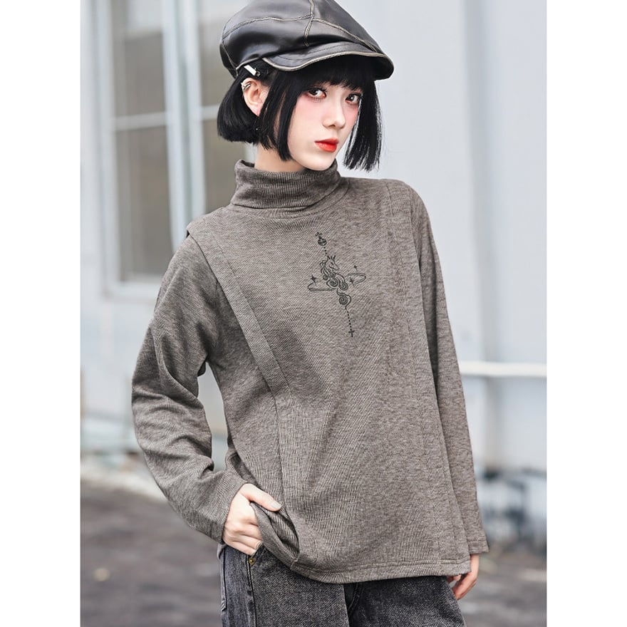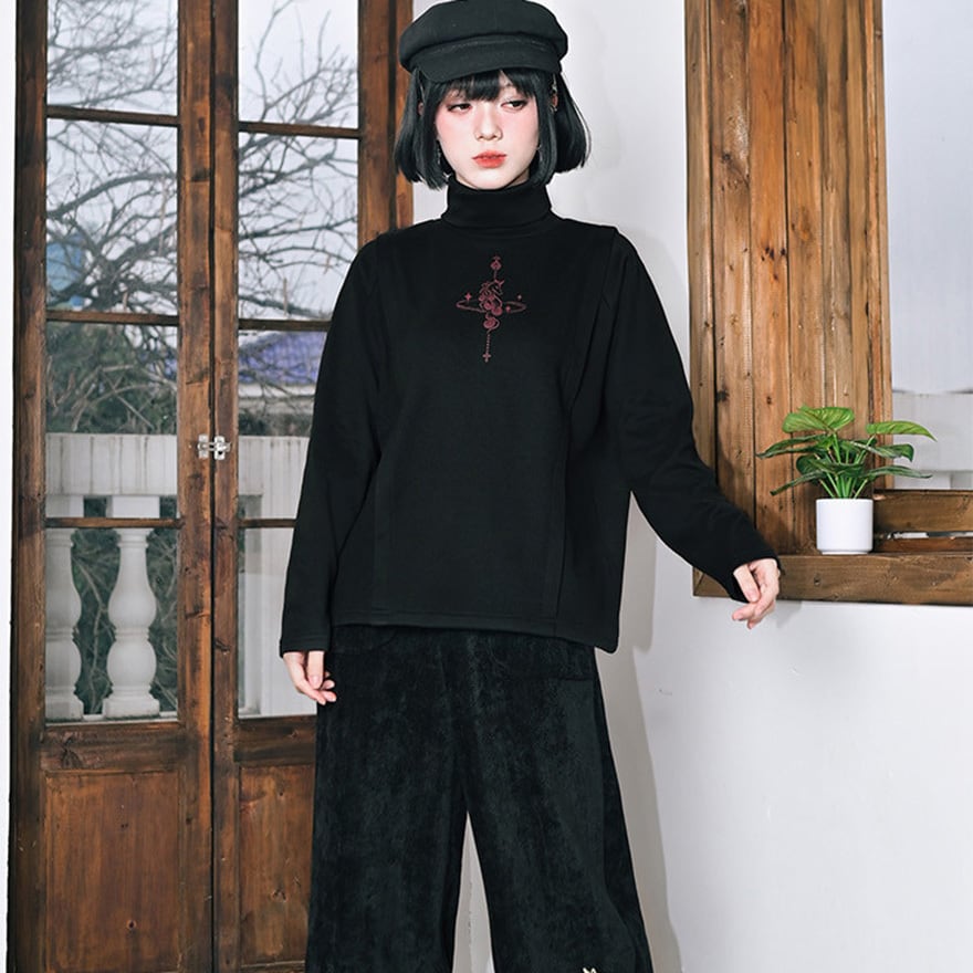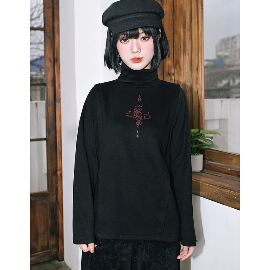 一般的なベーシックタートルネックと比較して、神秘的なモチーフと独自の切り替え設計を取り入れることで、ゴシックやダーク系ファッション寄りの強い独自性を持っています。