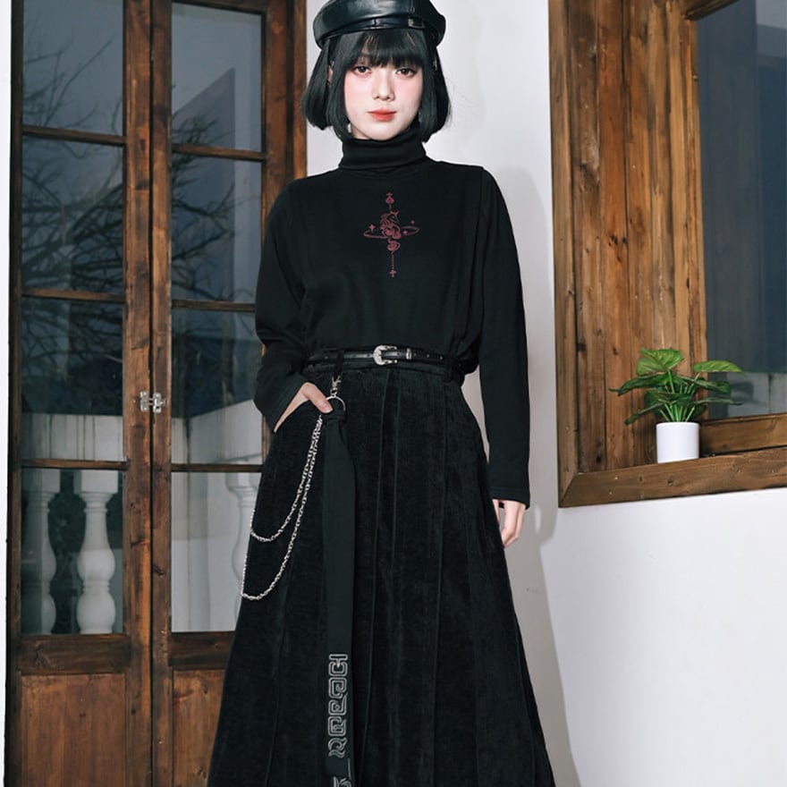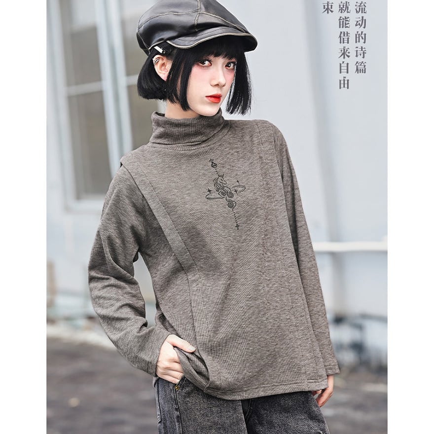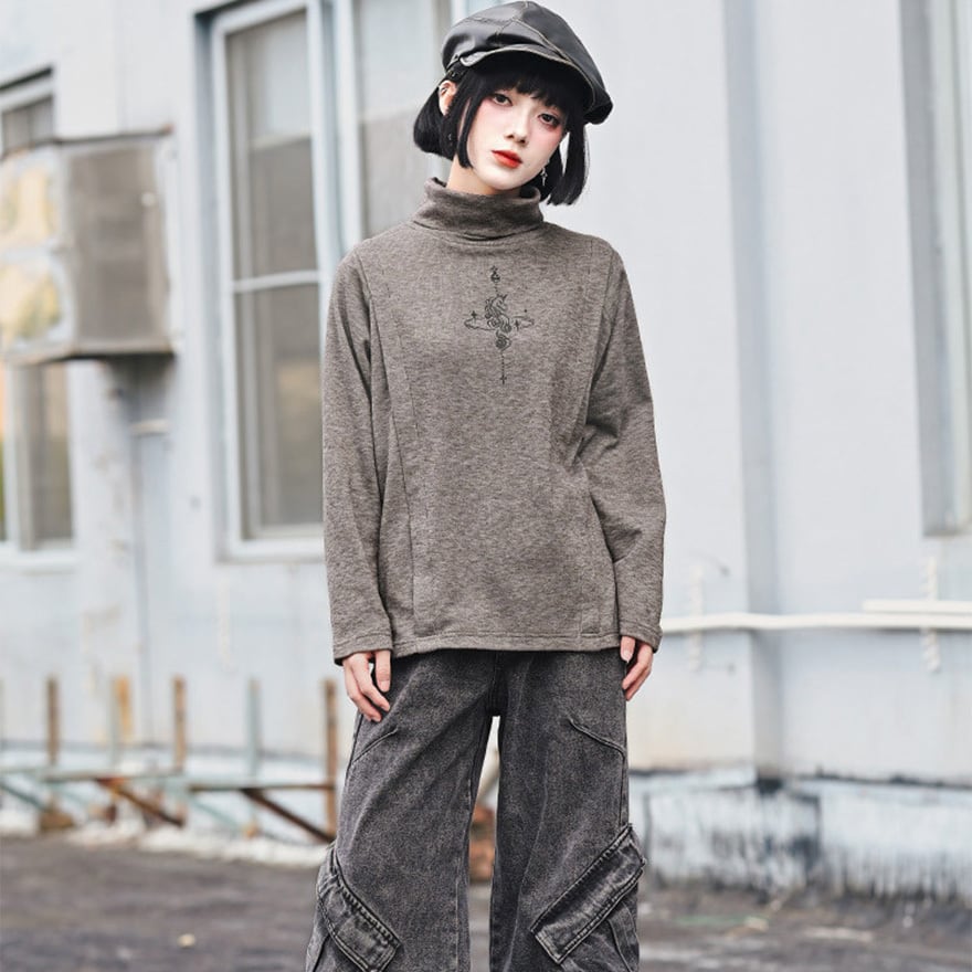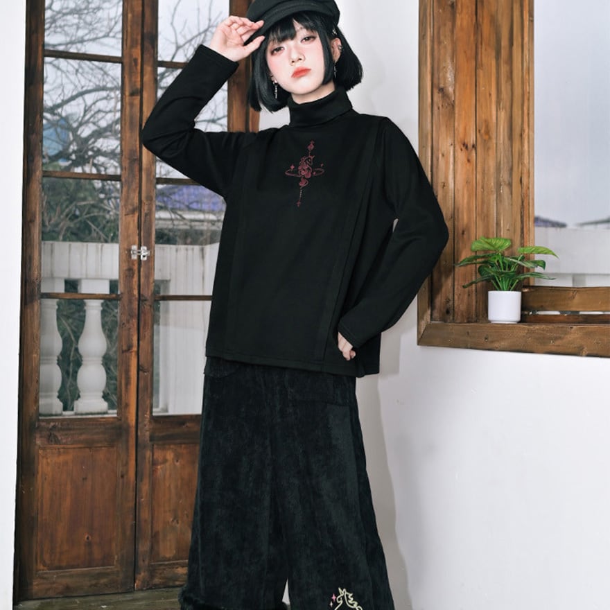 一般的なベーシックタートルネックと比較して、神秘的なモチーフと独自の切り替え設計を取り入れることで、ゴシックやダーク系ファッション寄りの強い独自性を持っています。