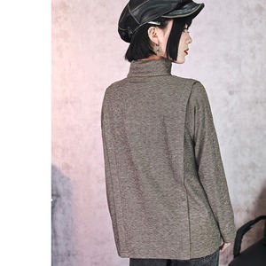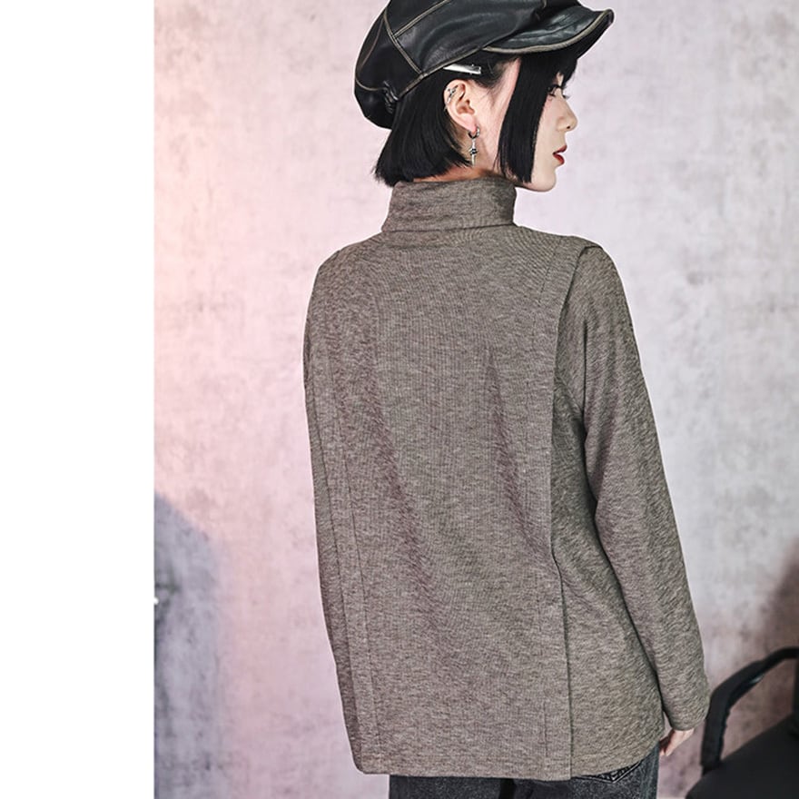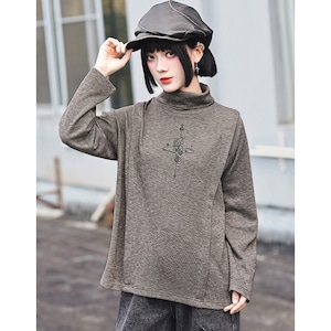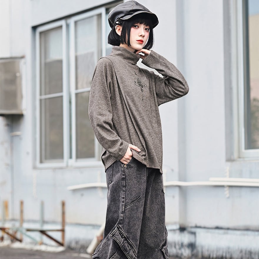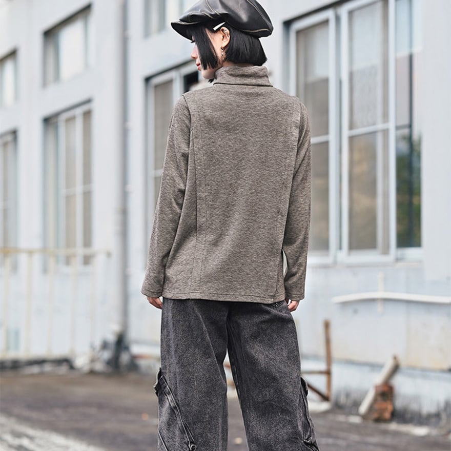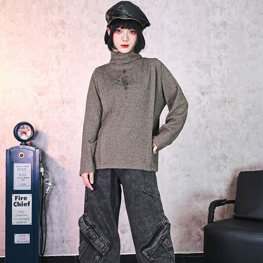 首元まで包み込むハイネック仕様で、モード感とサブカルチャーな雰囲気を両立しています。一枚での着用はもちろん、インナーとしても個性を放つ汎用性の高い一着です。