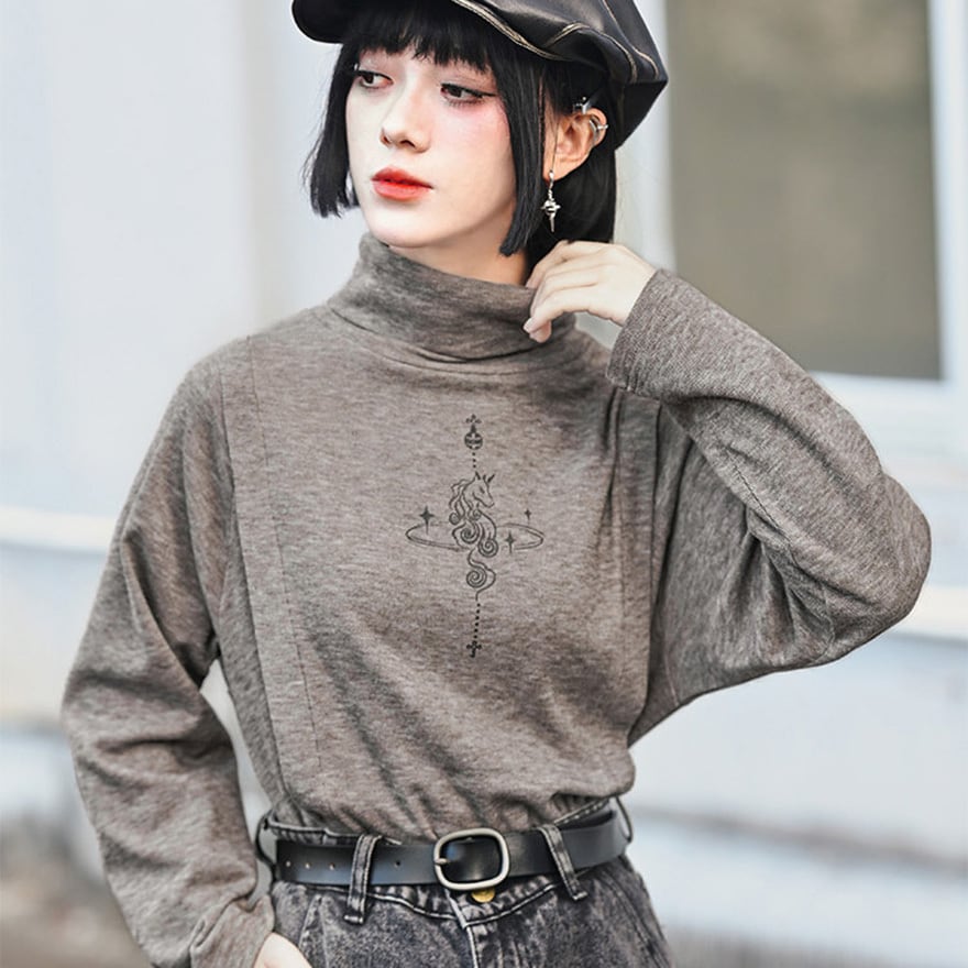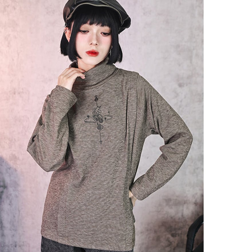 胸元に神秘的なユニコーンと天体をモチーフにした紋章風グラフィックを配したハイネックカットソーです。
