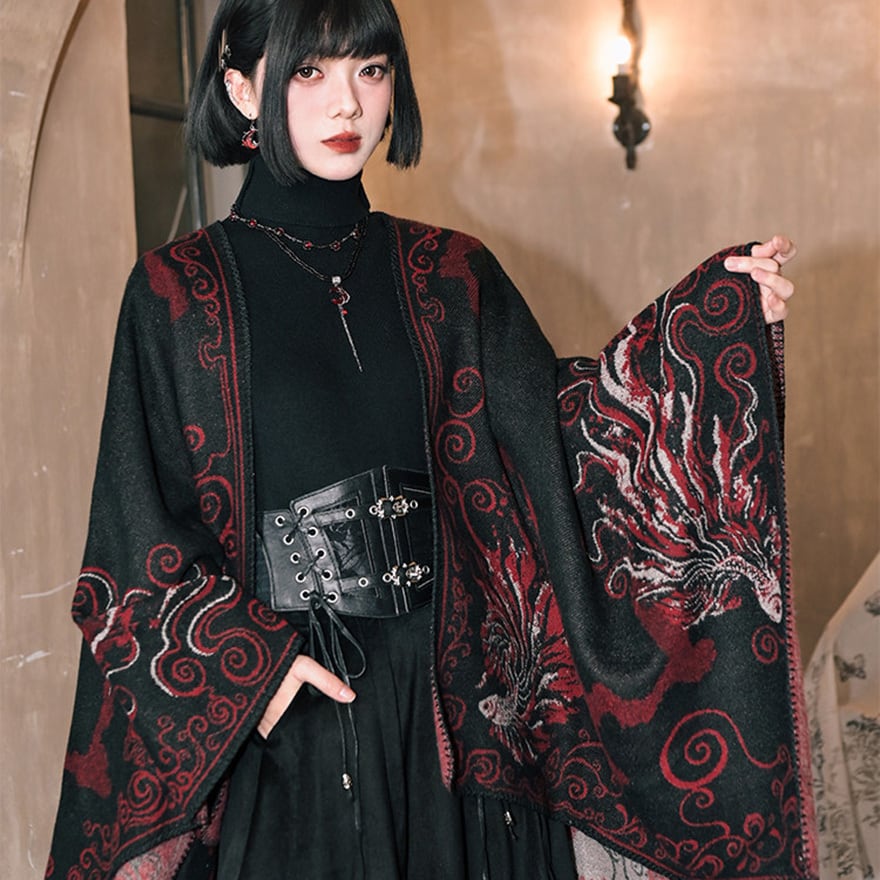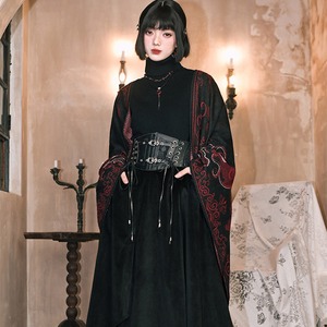 背面には広範囲のシャーリング素材を採用しており、フィット感と着脱のしやすさを両立。サブカル・ゴシックスタイルの主役となる装飾性の高い一品です。