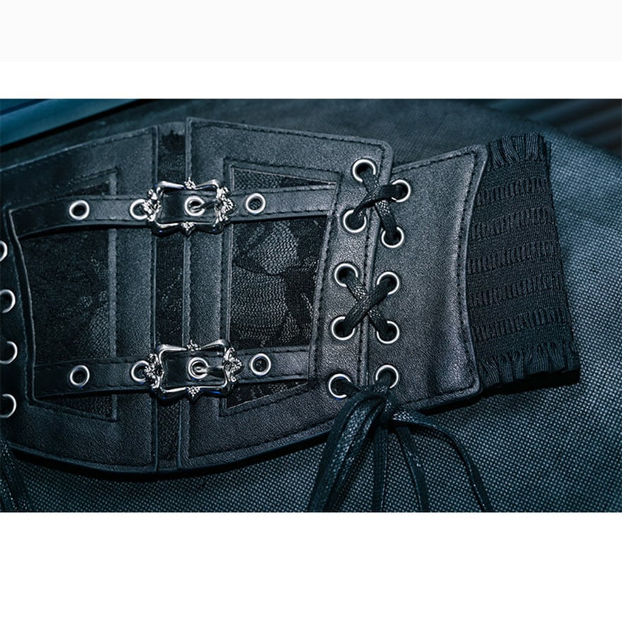 黒のフェイクレザーと繊細なレースを組み合わせた、ダブルレースアップ仕様のコルセットベルトです。
