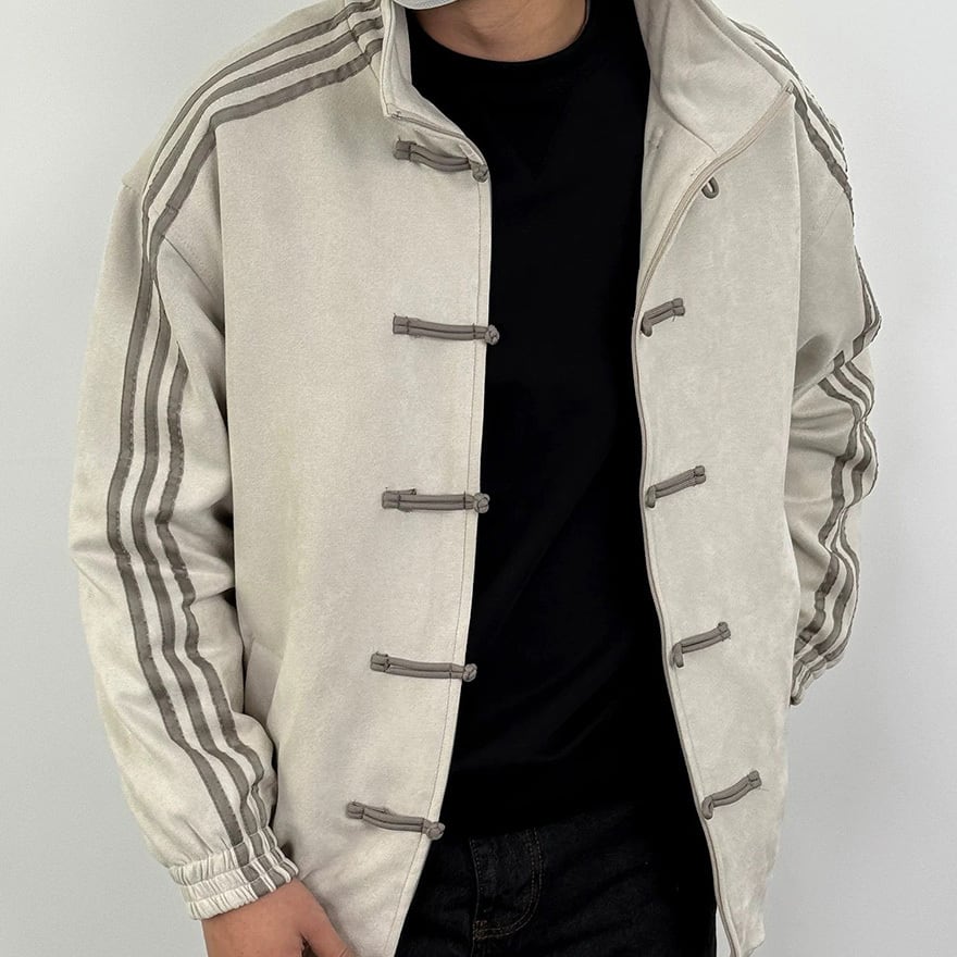 伝統的なチャイナボタンとスポーティーな3本ラインを融合させた、ネオ中華テイストのトラックジャケットです。