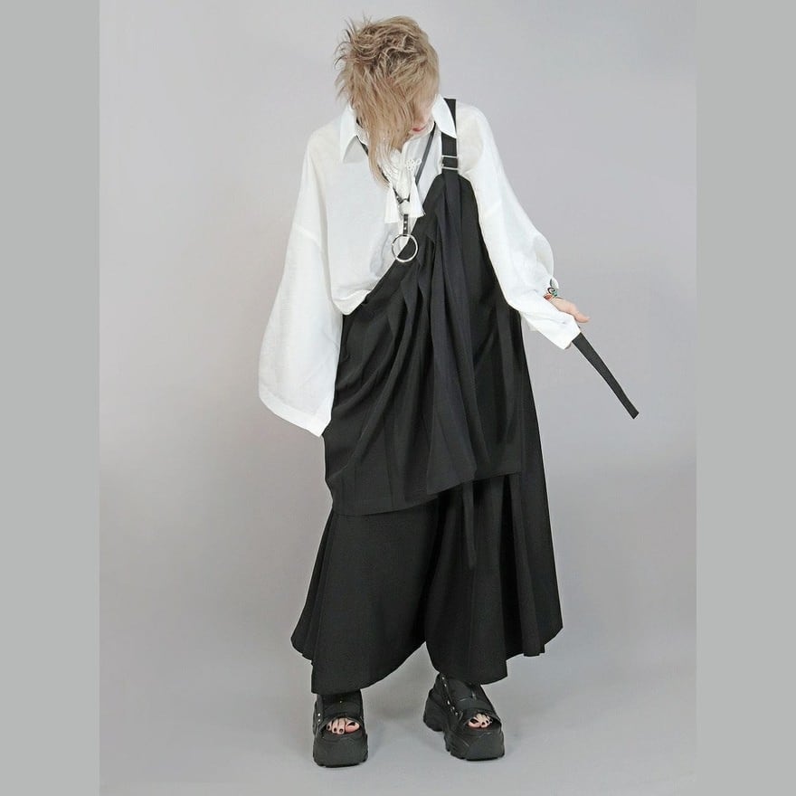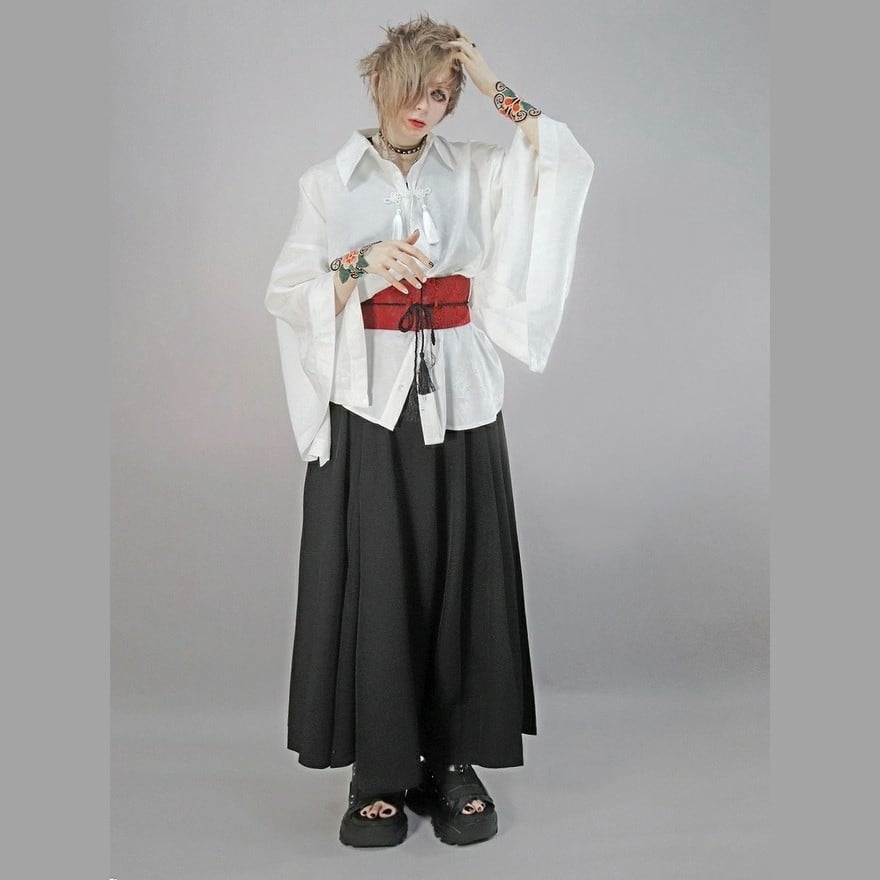原宿系サブカルスタイルを軸に、不規則なプリーツデザインを取り入れた和服風ワイドパンツです。
