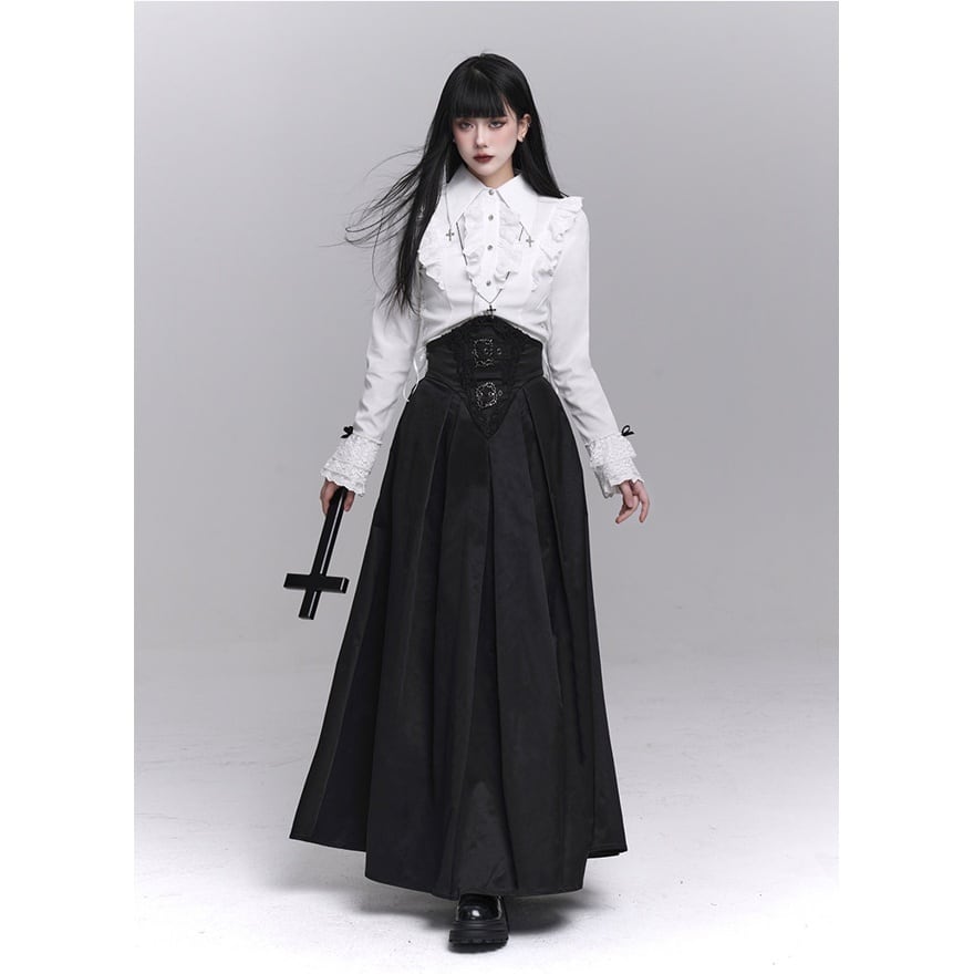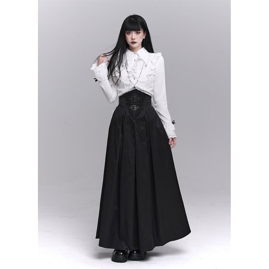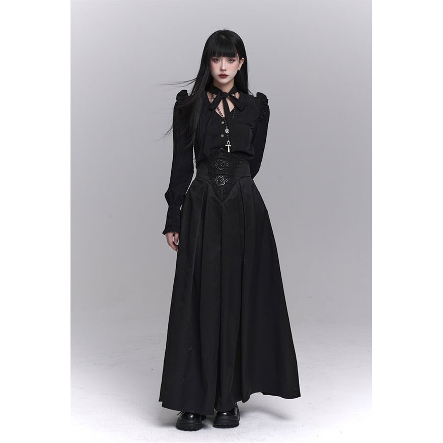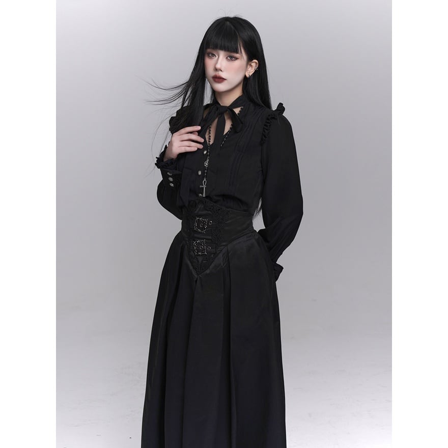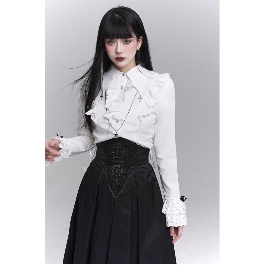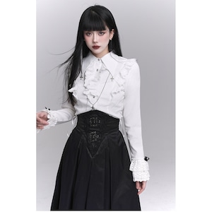 フリル装飾と縦ラインを強調したシルエットが印象的な、ゴシックテイストの長袖ブラウスです。