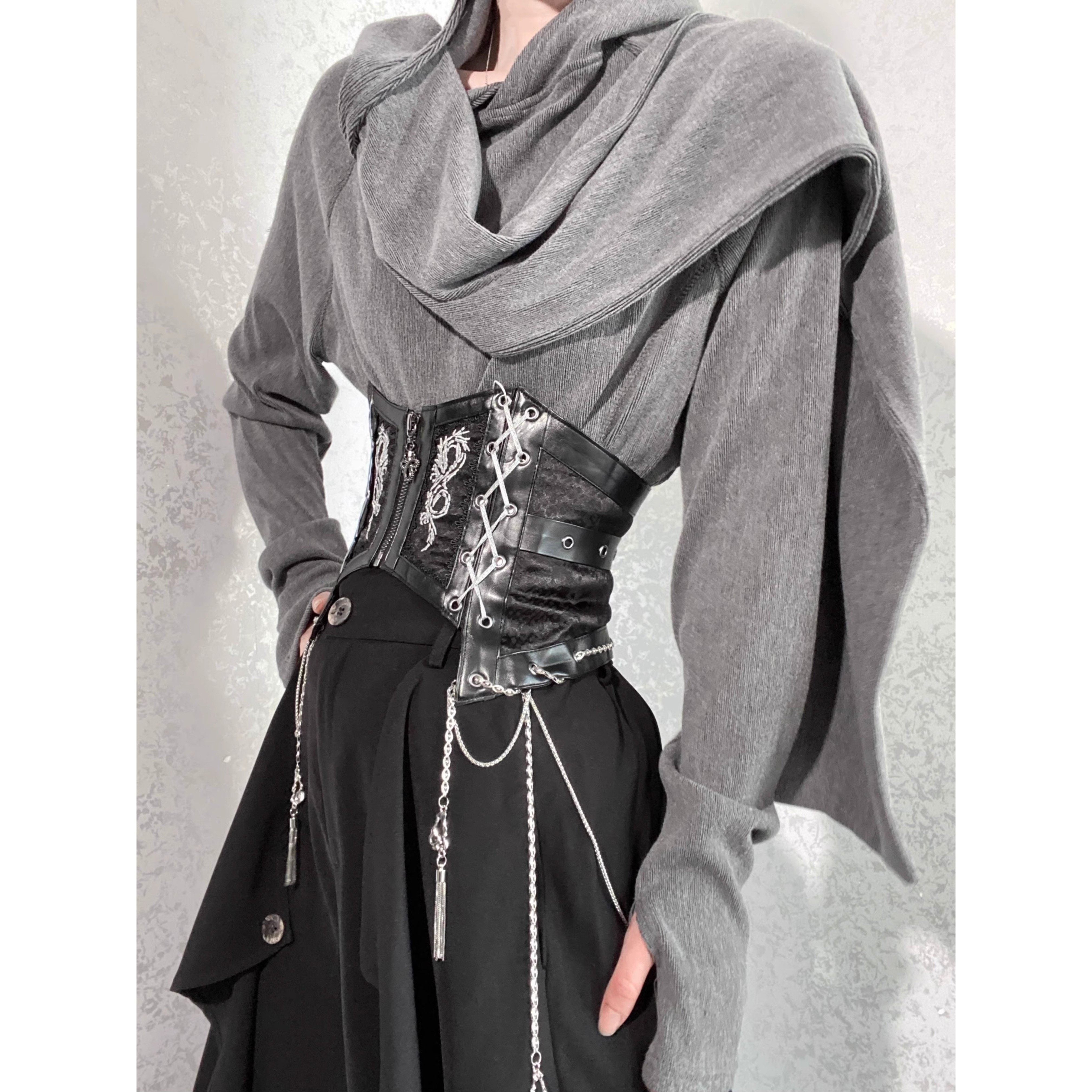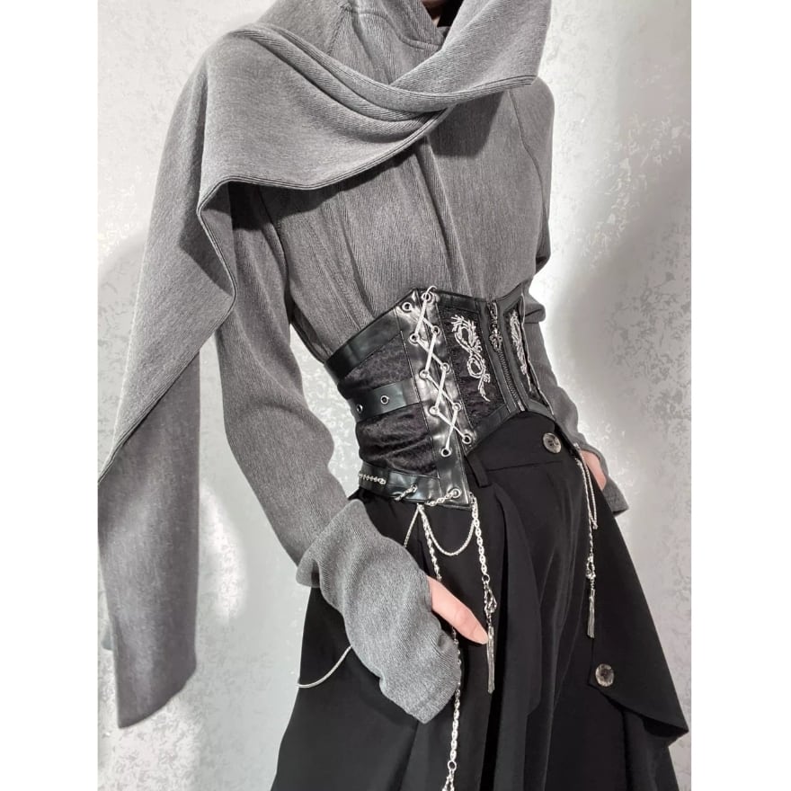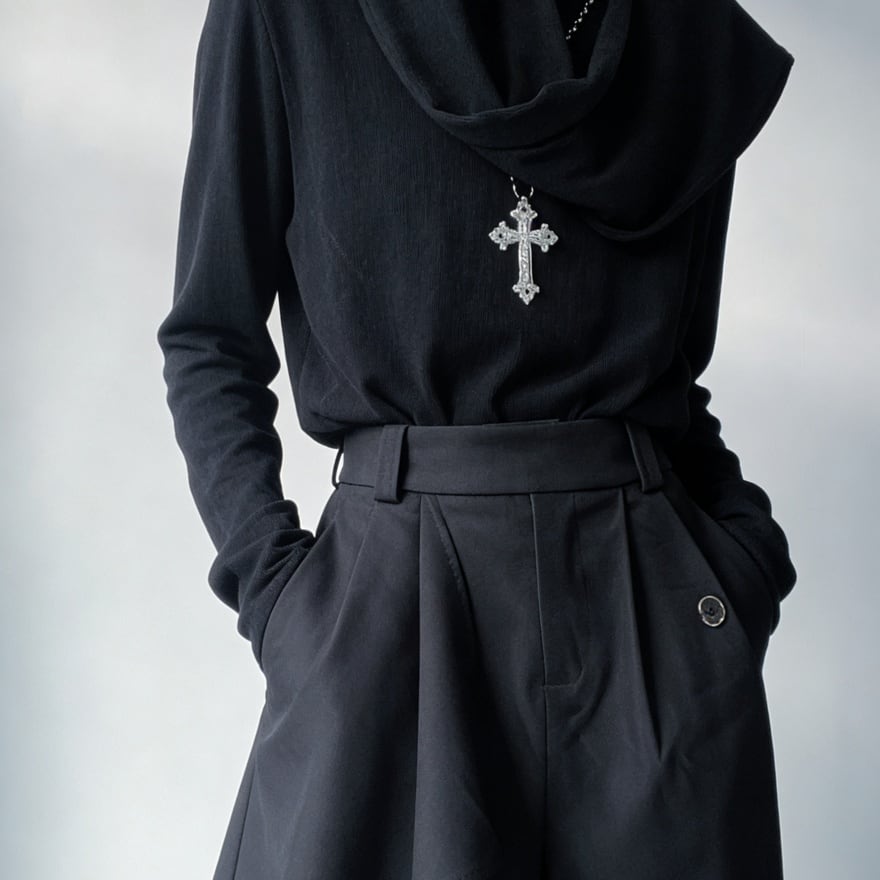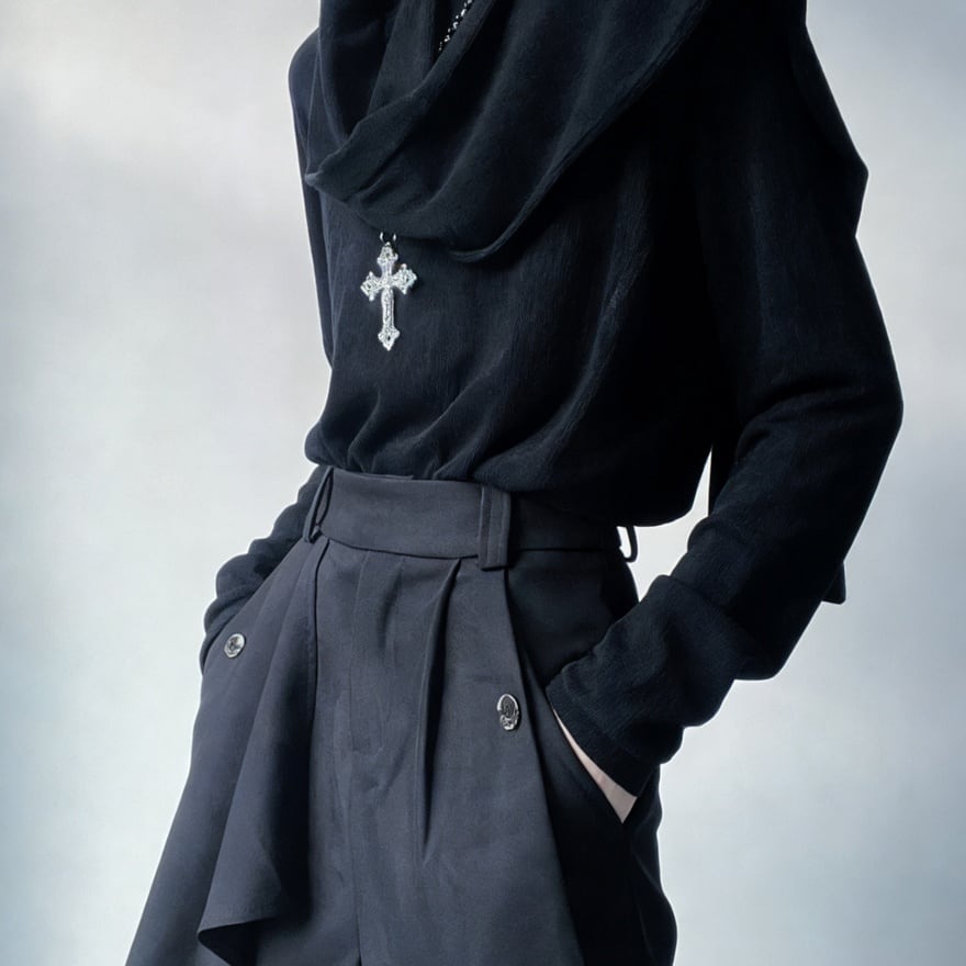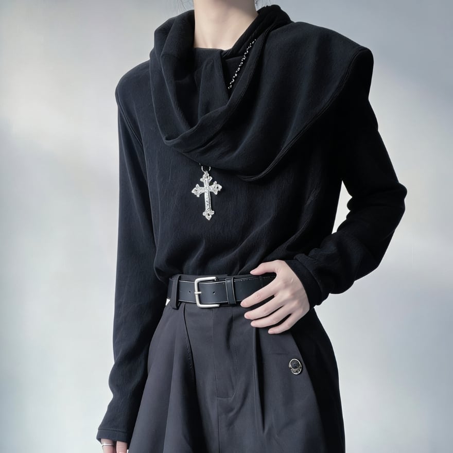 落ち着いたカラーと質感により、ゴシック・モード・サブカルスタイルに自然に溶け込みます。単体でもレイヤードでも使いやすい一着です。