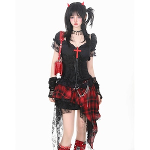 赤十字モチーフが映えるゴシックセットアップ|レース×フリルで魅せるサブカル系|天使と悪魔