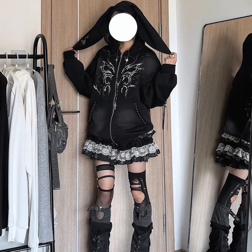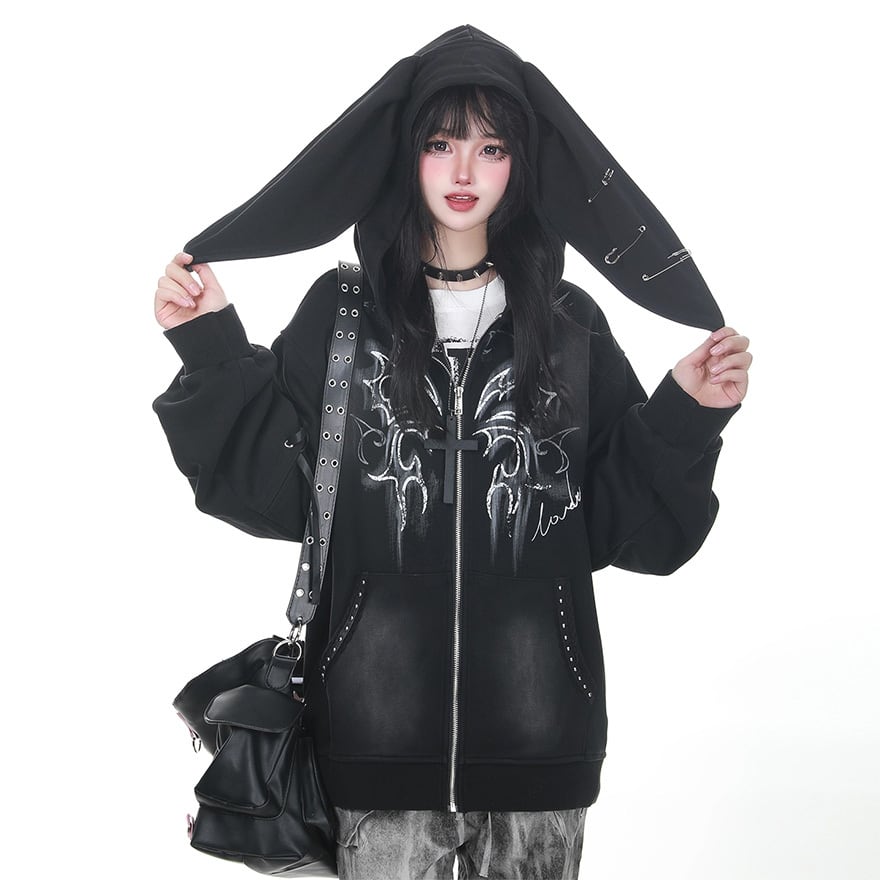 ロングイヤーフード付きジップパーカー|ゴシックプリント入りサブカル系オーバーサイズアウター|天使と悪魔