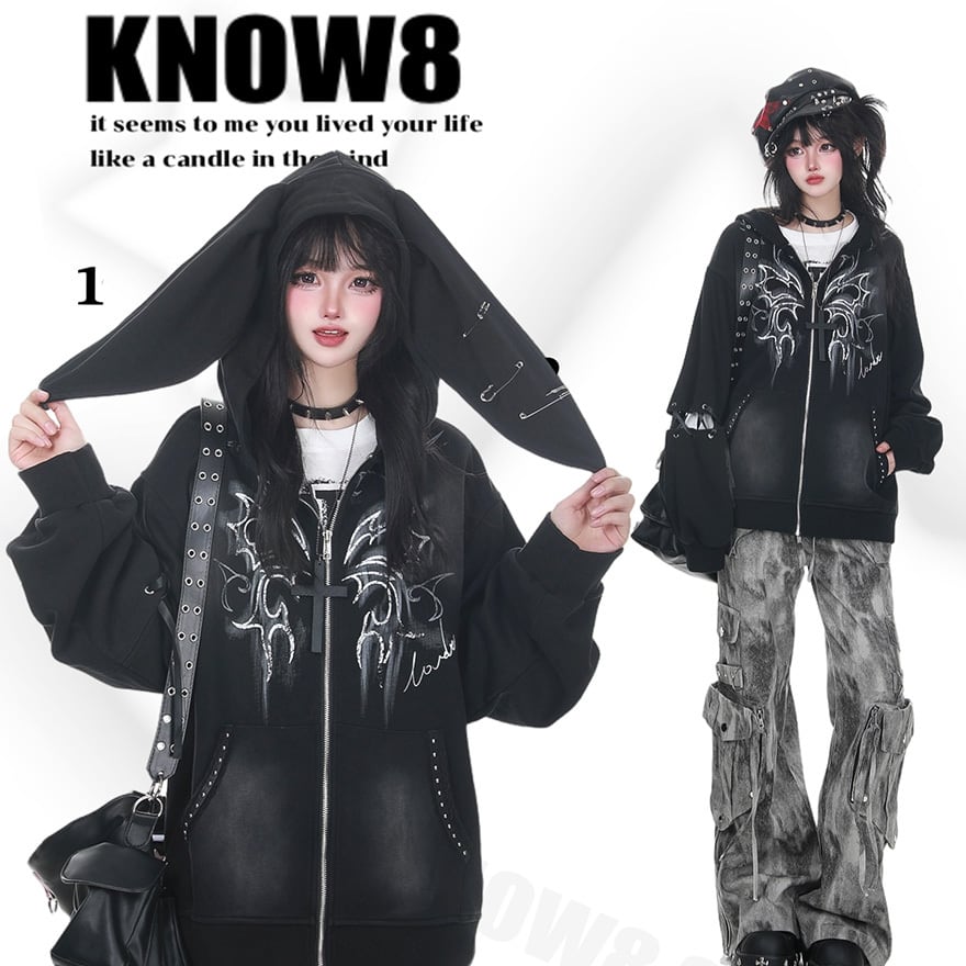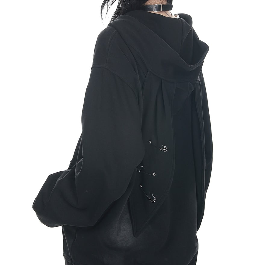 サブカル系ジャンルのジップアップパーカーです。フード部分にデザインされた非常に長いうさ耳と、左耳に施された3つの安全ピン装飾が最大の特徴です。