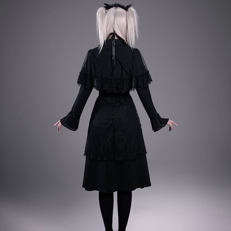 裾付近には蝙蝠の羽、ハート、十字架を組み合わせた金属チャームが吊り下げられています。素材はシフォンおよびレースです。