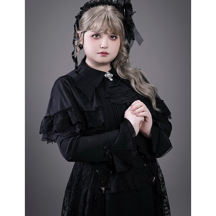黒色のシフォン生地をベースに、繊細なレースを重ねた重厚感のあるデザインが特徴です。