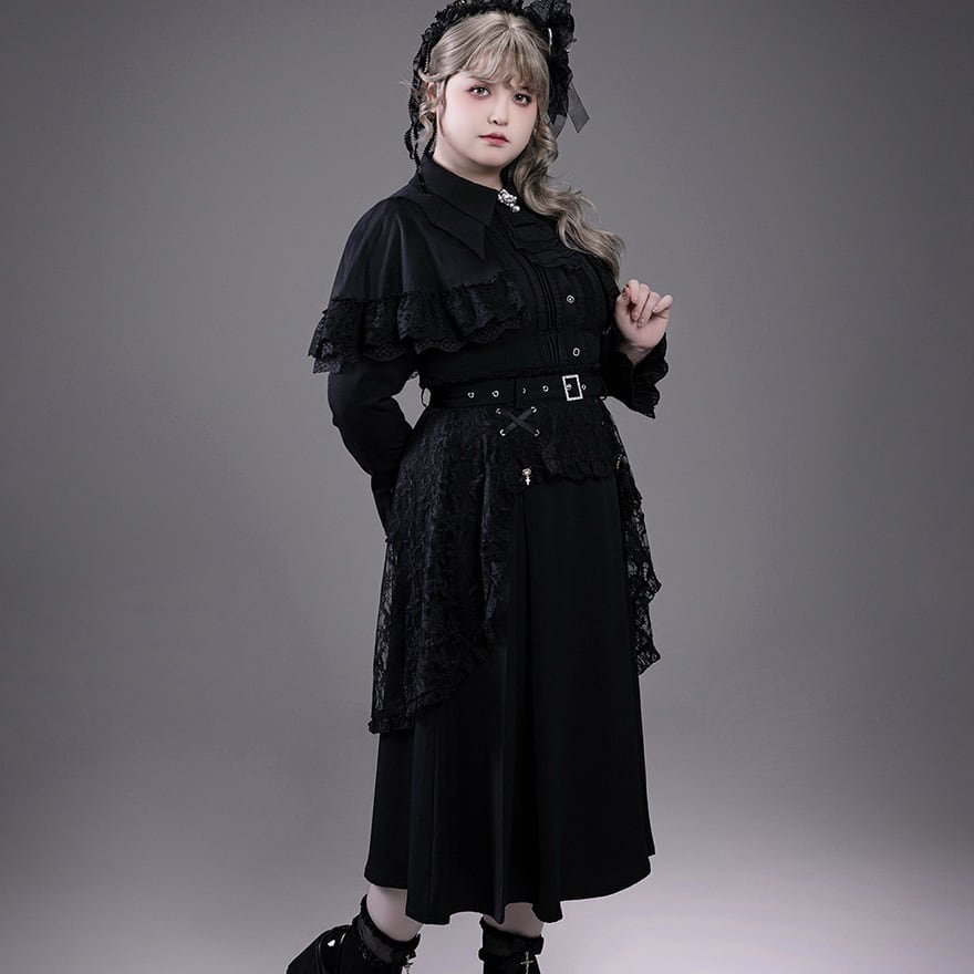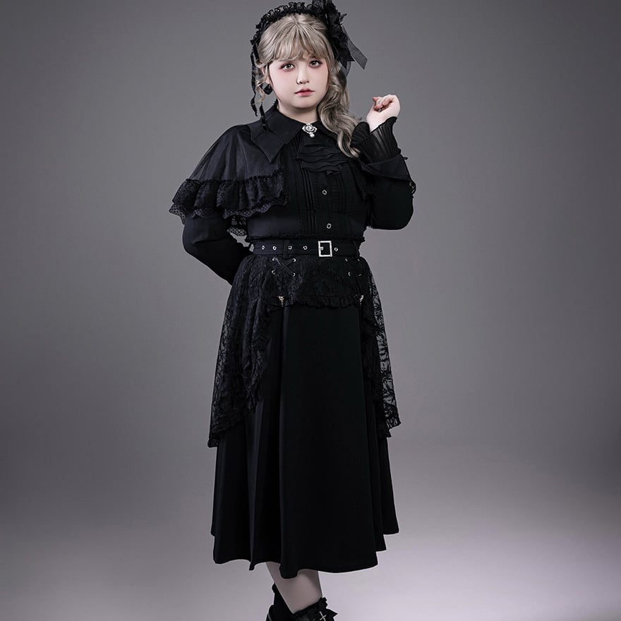 黒色のシフォン生地とレース生地のレイヤード構造です。ウエスト前面にはハトメを通したリボンの編み上げ装飾があり、中心には銀色のスクエアバックルベルトが配置されています。