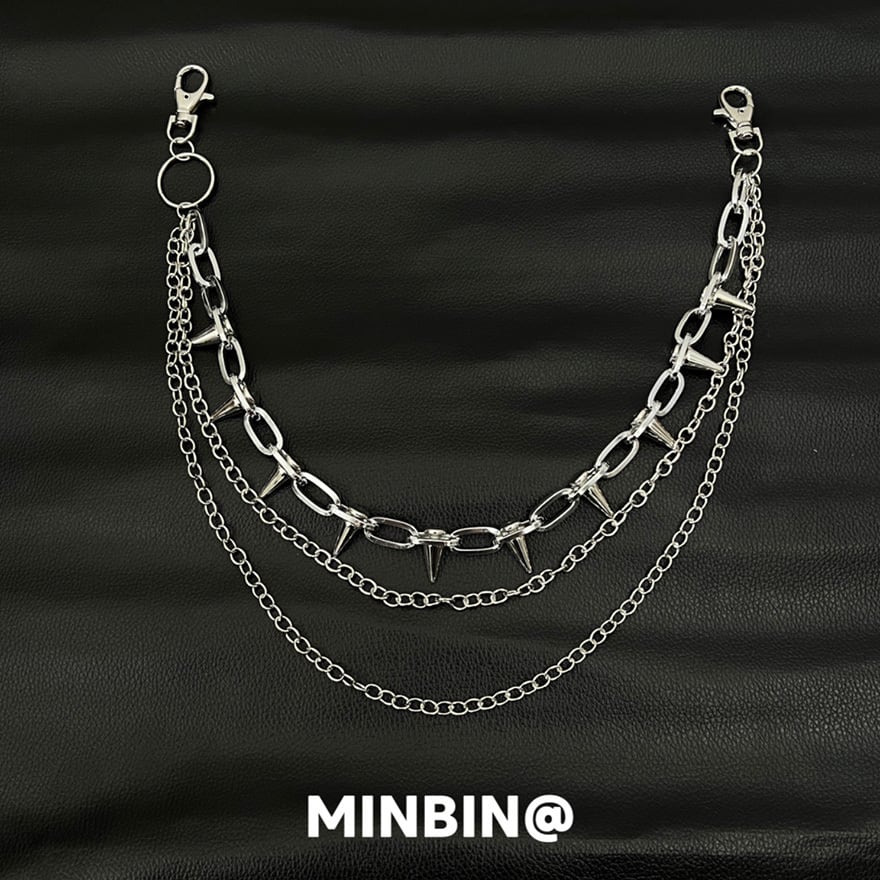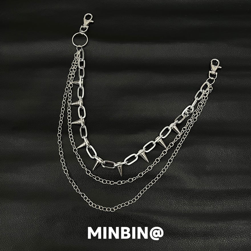 3層に重なった銀色のメタルチェーンが特徴で、そのうちの1本には円錐形のスパイクパーツが等間隔に配置されています。