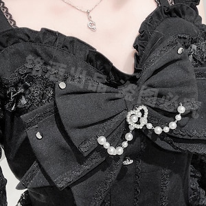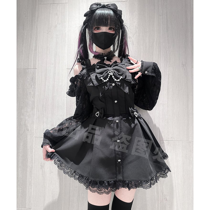 胸元にはパールのチェーンとハートチャームが付いた大きなリボンがあしらわれており、同系統のデザインのチョーカーとヘッドドレスが付属します。