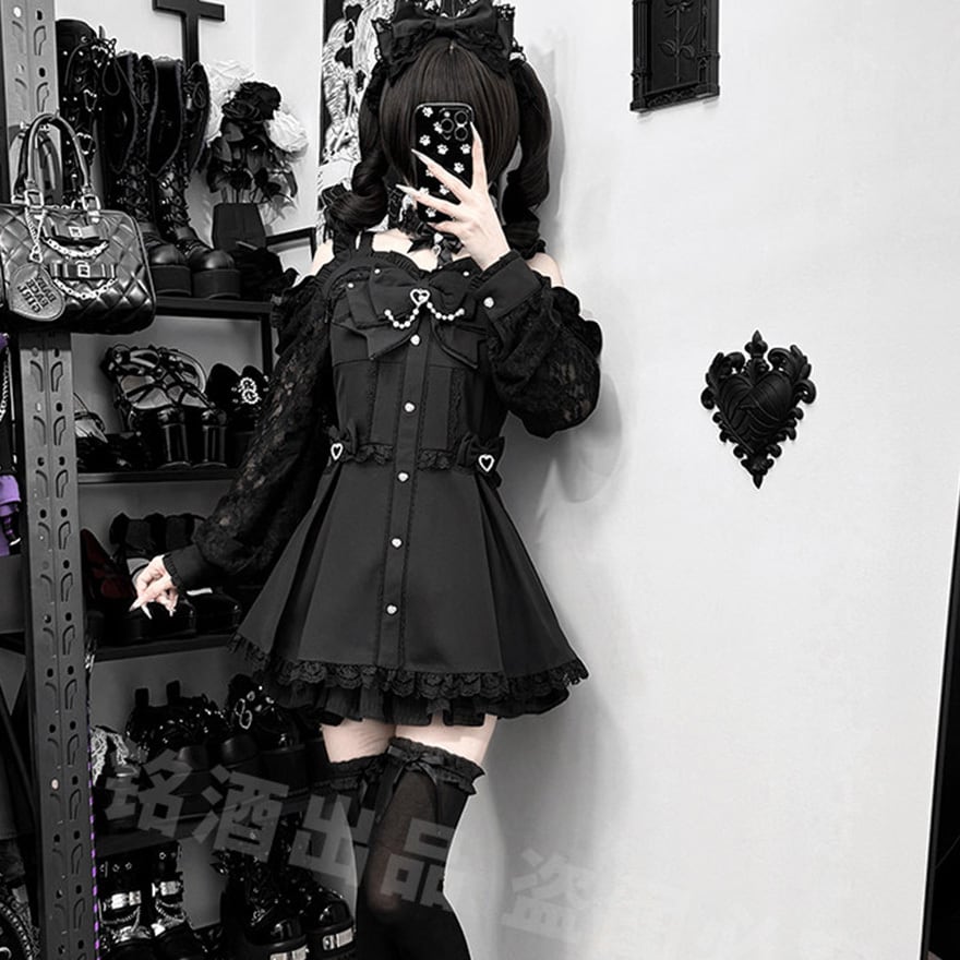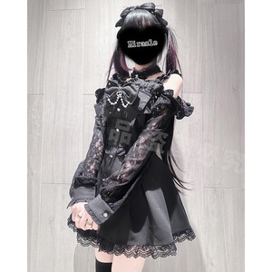黒色を基調としたワンピースに、レース素材の袖やフリル付きの裾を組み合わせたデザインです。