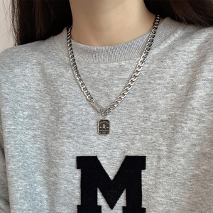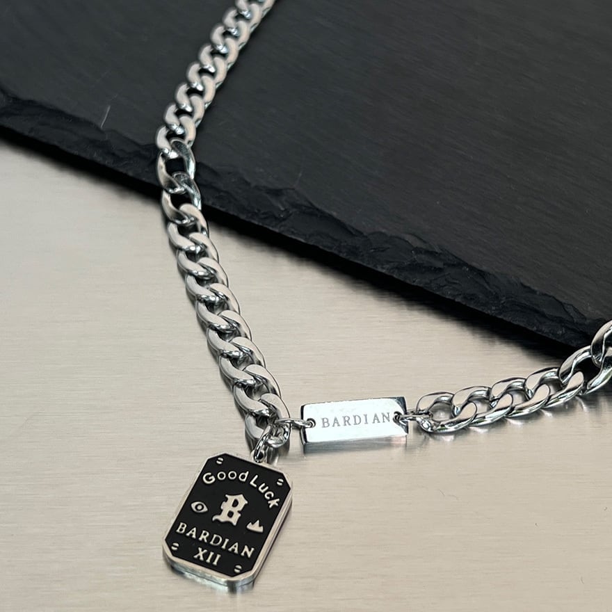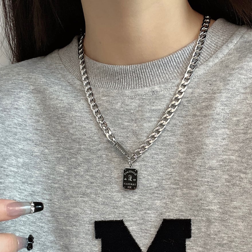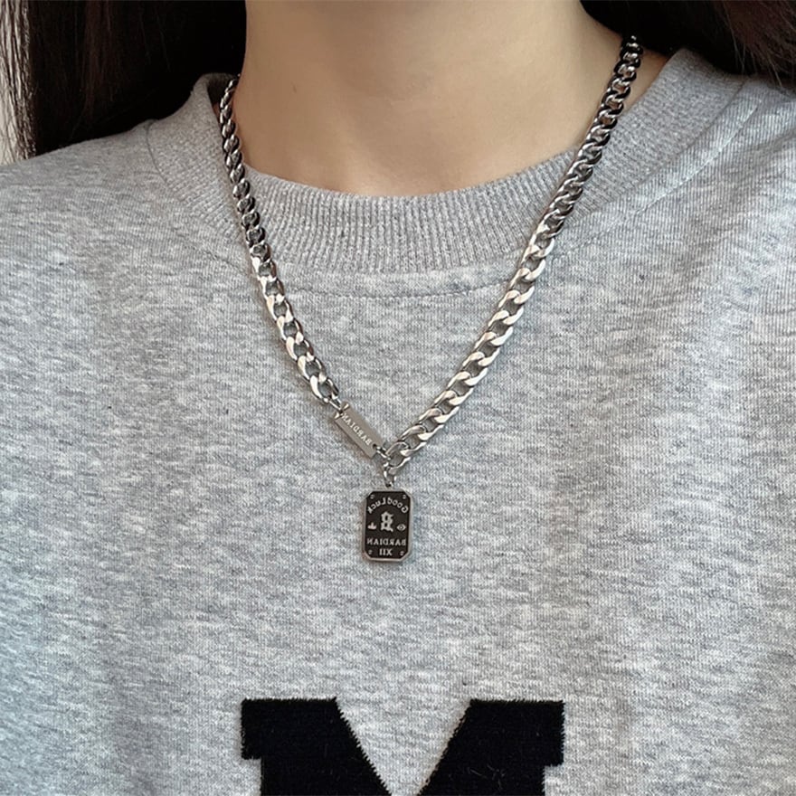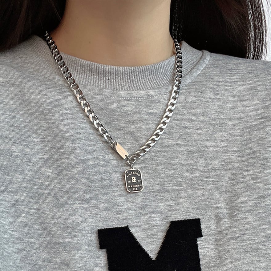 ロゴプレート付きメタルチェーンネックレス|サブカル系ファッションに映えるシルバーアクセサリー|天使と悪魔