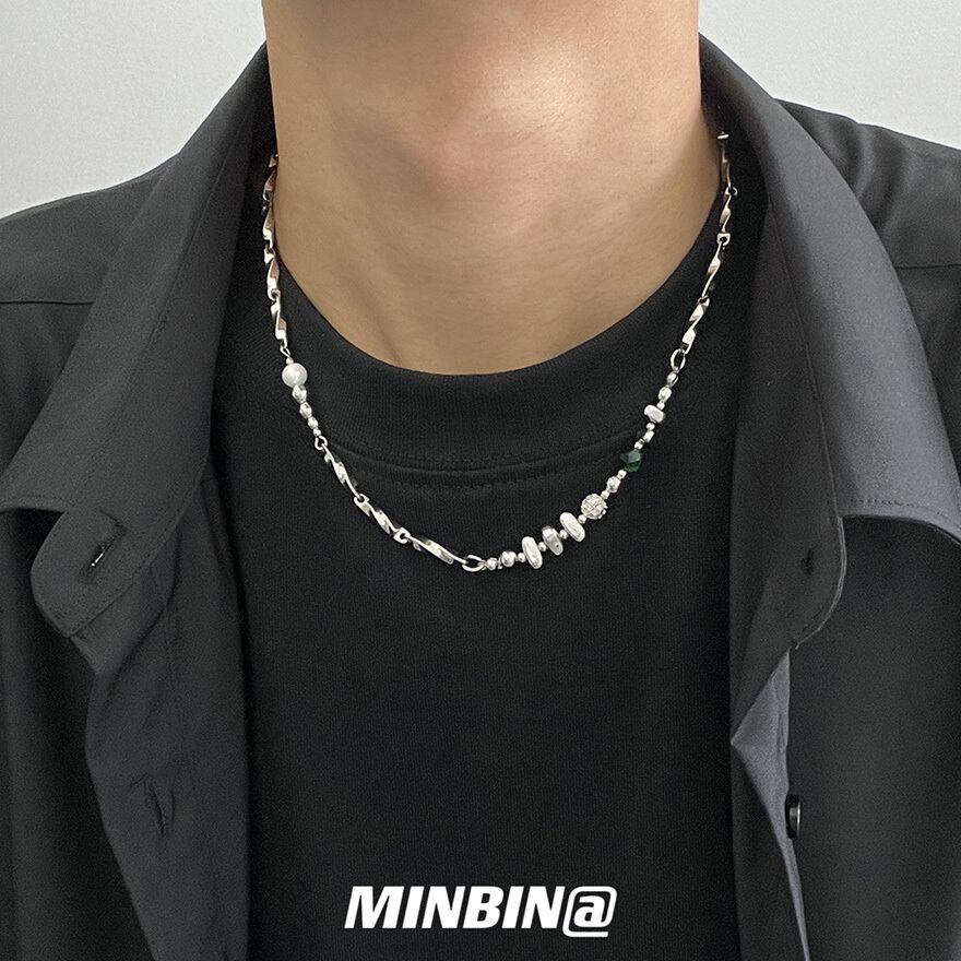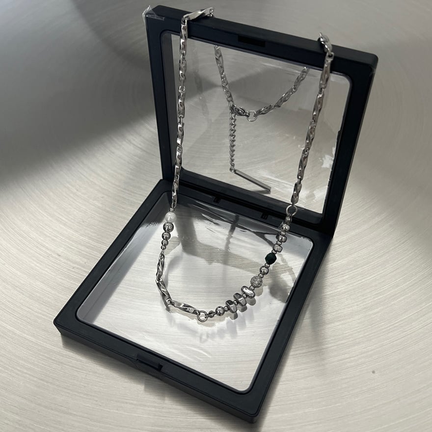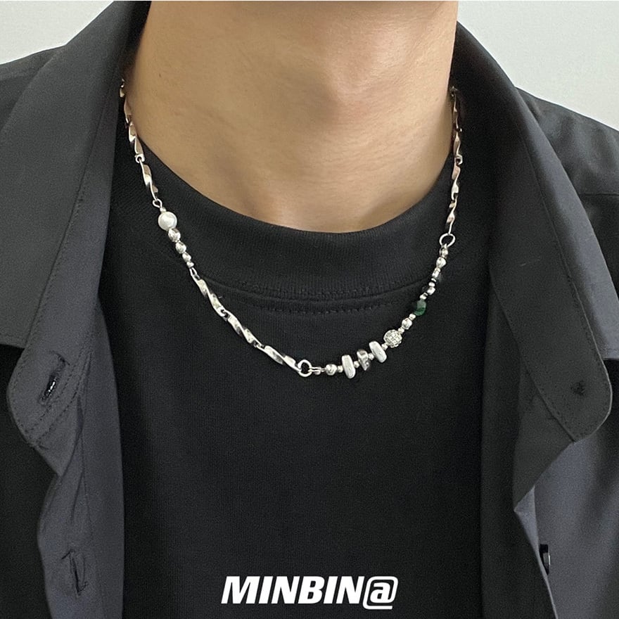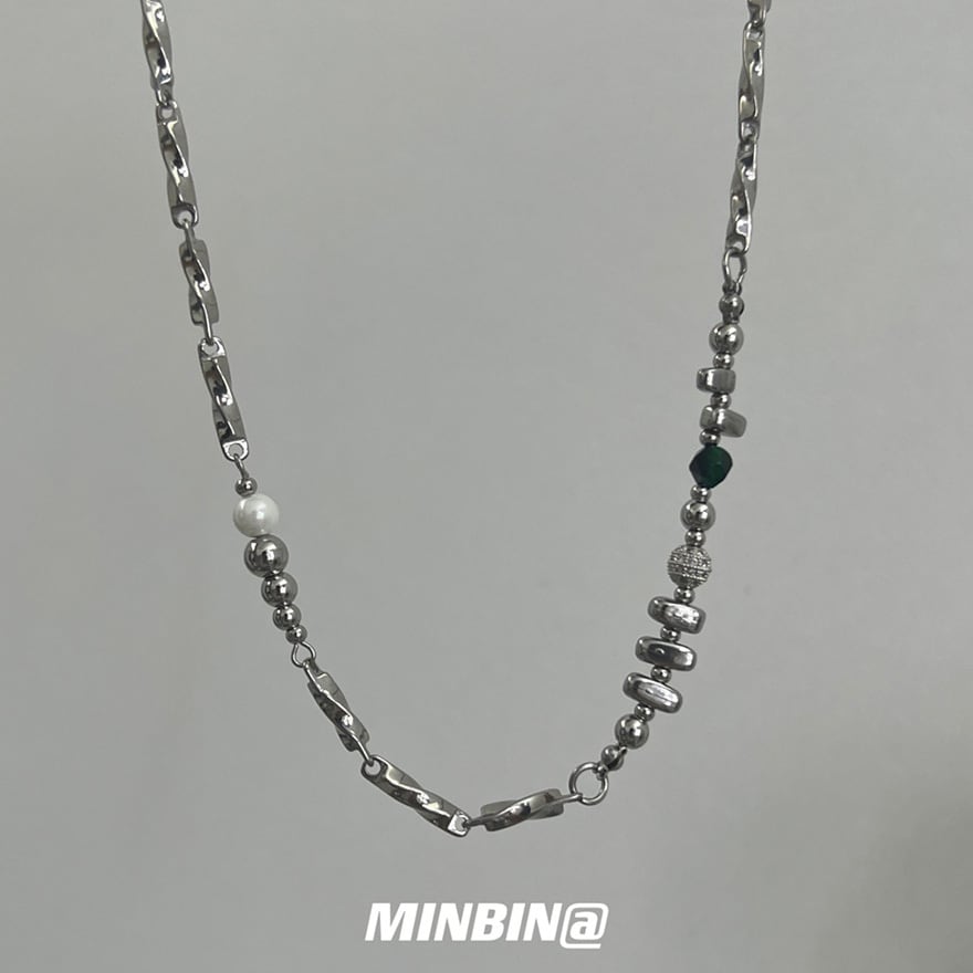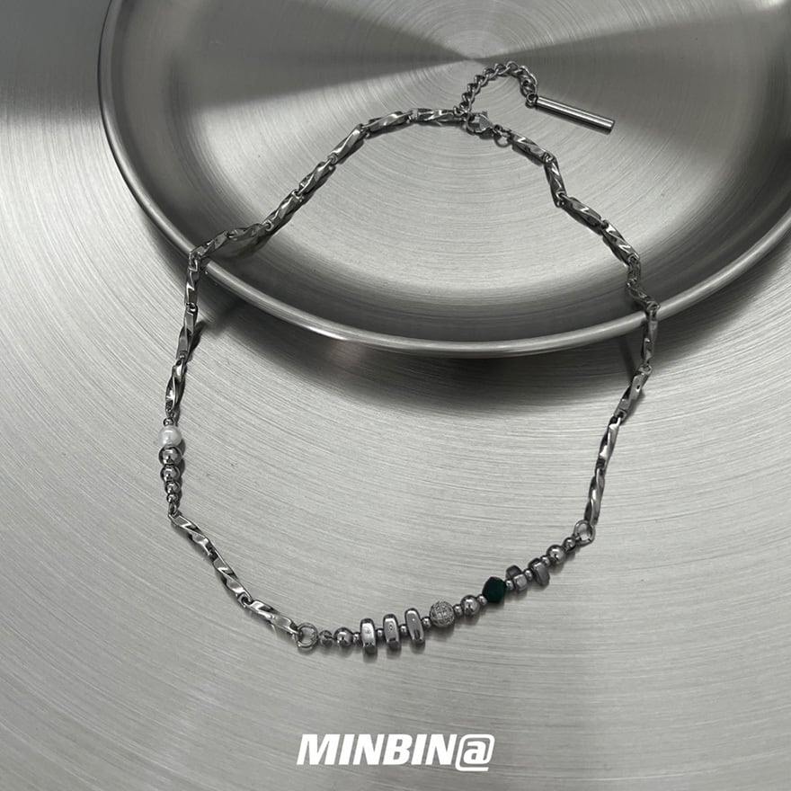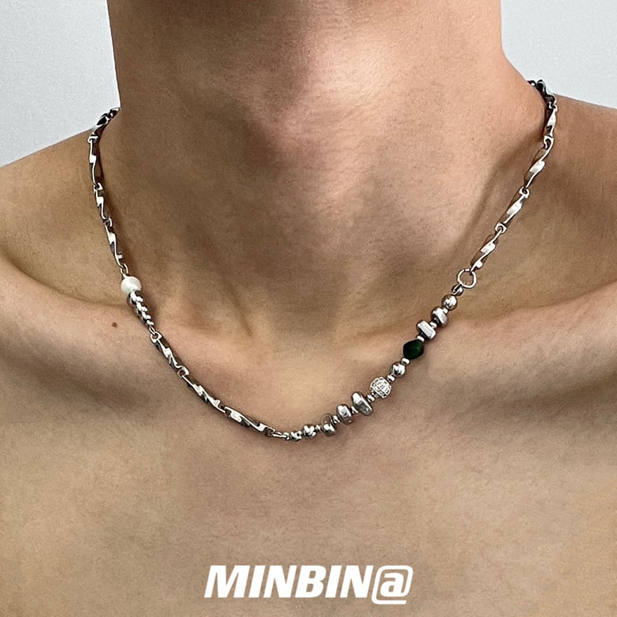 捻りのある鎖に白色の貝珠、緑色の天然石、さらに球体や円筒形などの金属製部品を不規則に配した設計が特徴です。
