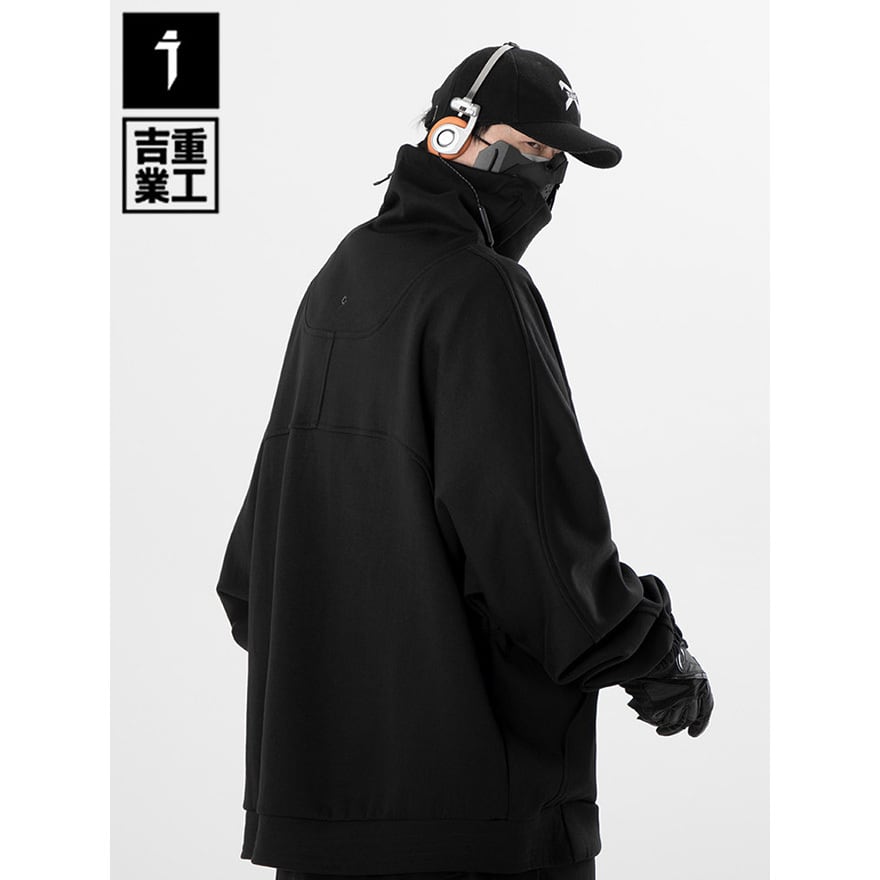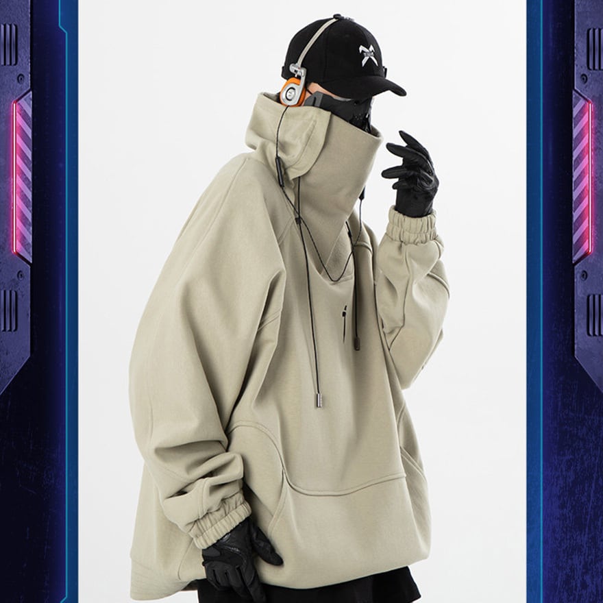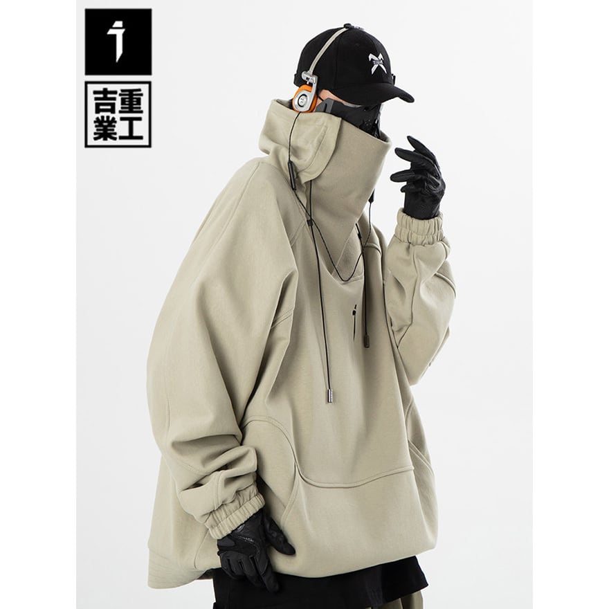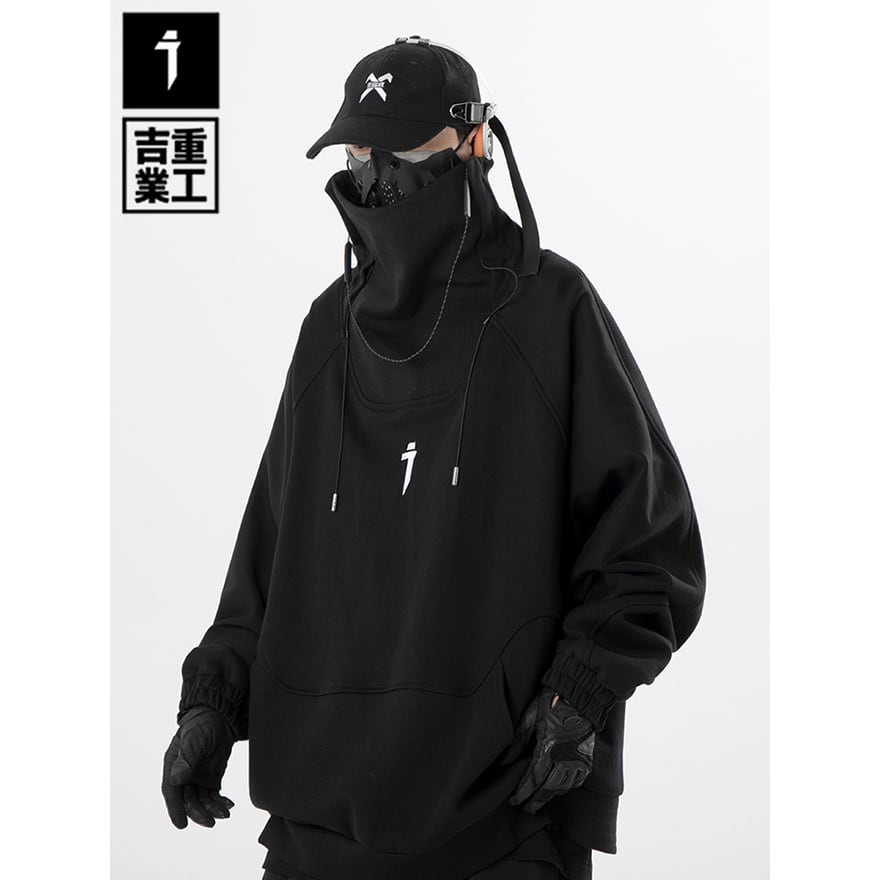 ストリート寄りジャンルに属する、顔の下半分まで隠すことができる極めて高い襟のデザインが特徴の長袖パーカーです。