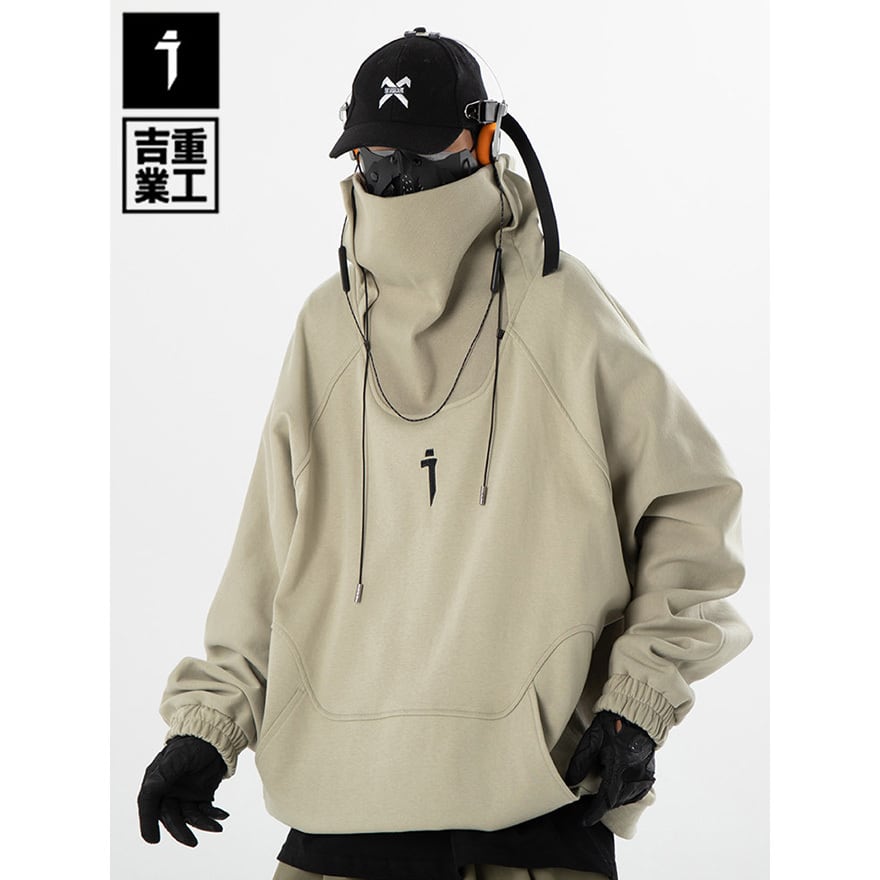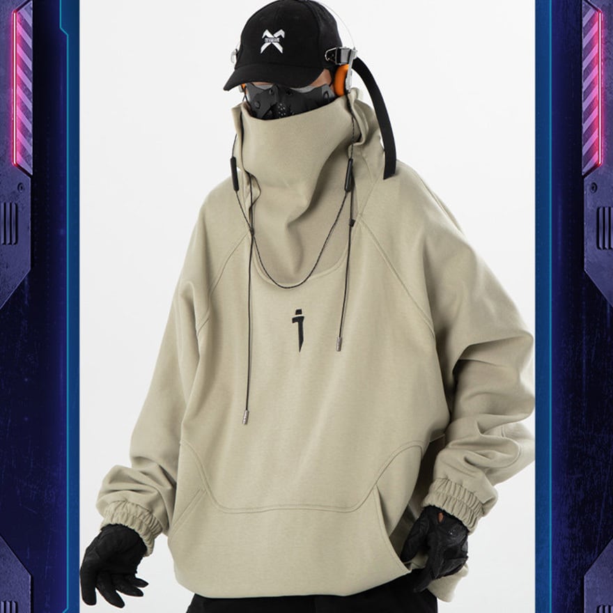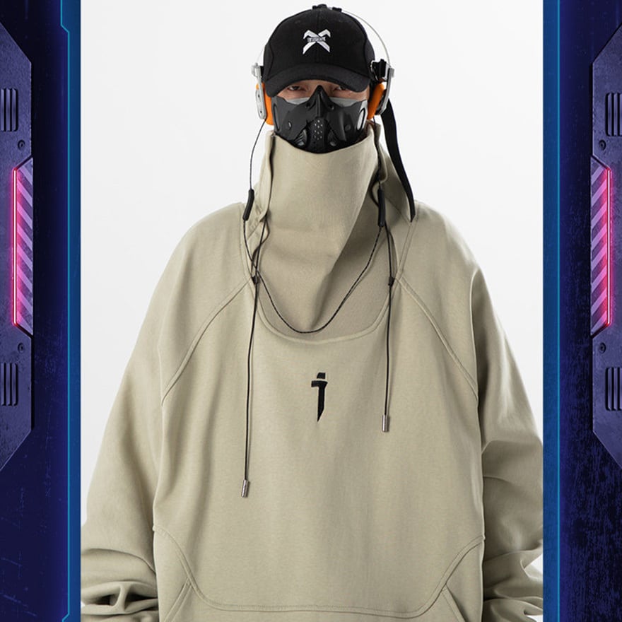 サイバーパンク風 ハイネックプルオーバーパーカー|フェイスガード対応 テック系フーディ(ブラック/サンド)|天使と悪魔
