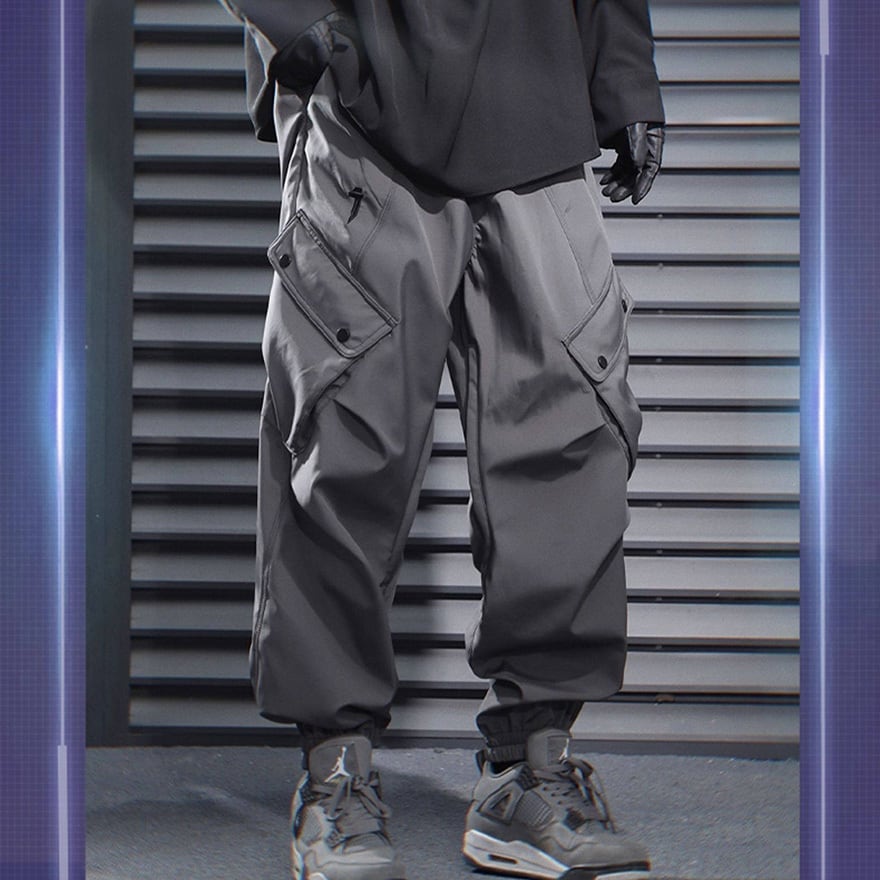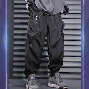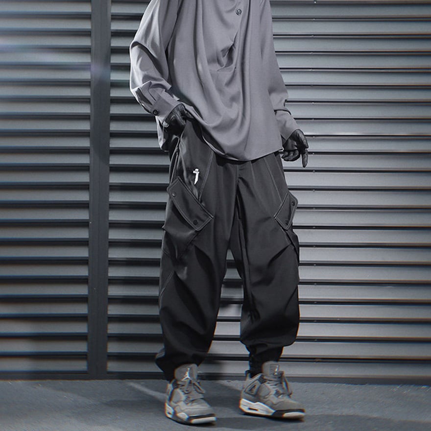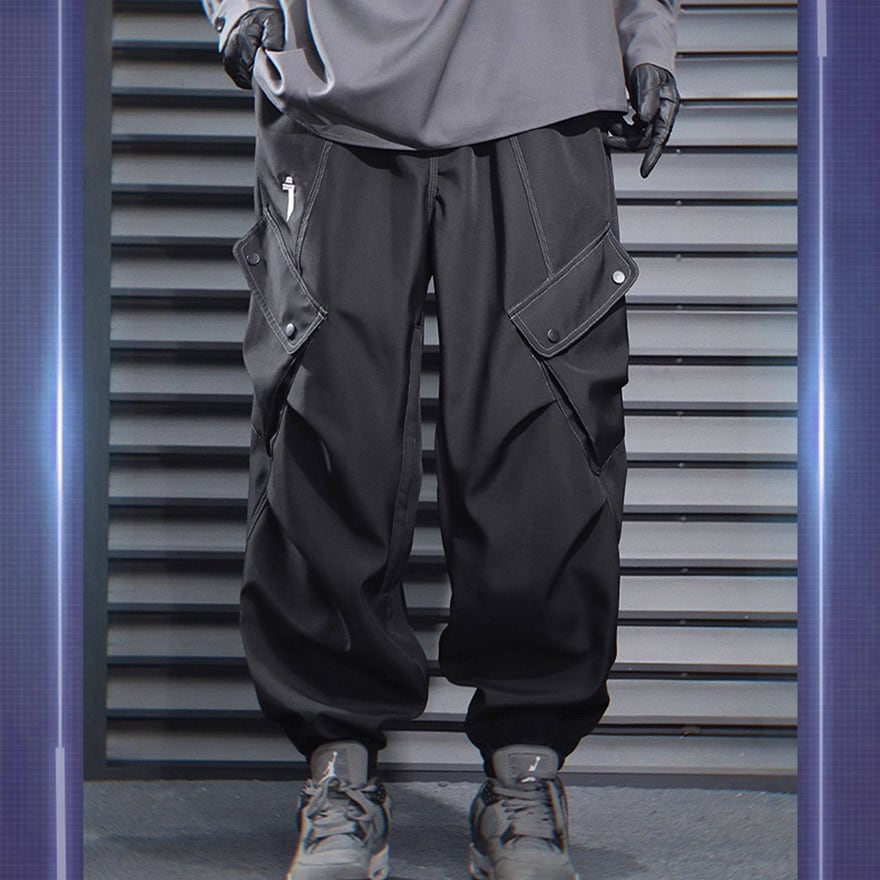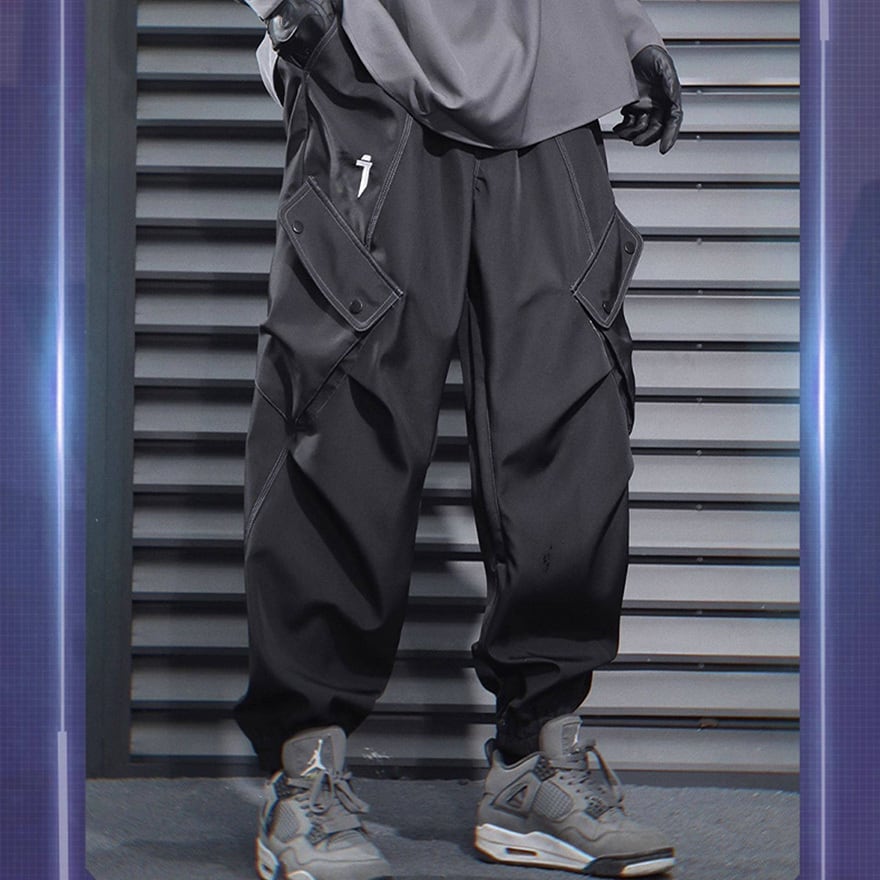 サイバーパンク風 テック系カーゴパンツ|ユーティリティポケット付き ジョガーパンツ(ブラック/グレー)|天使と悪魔