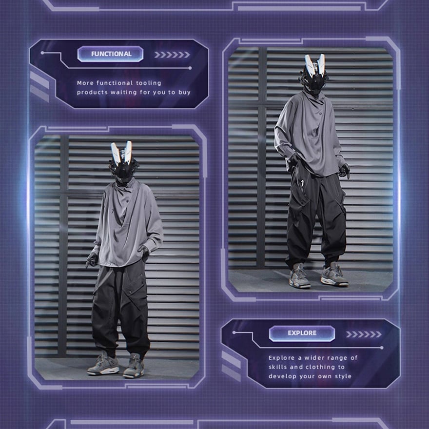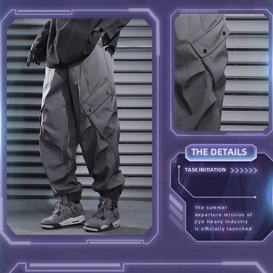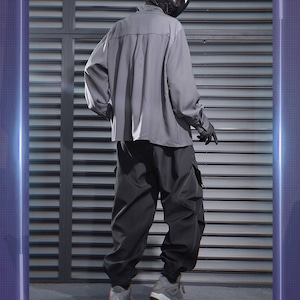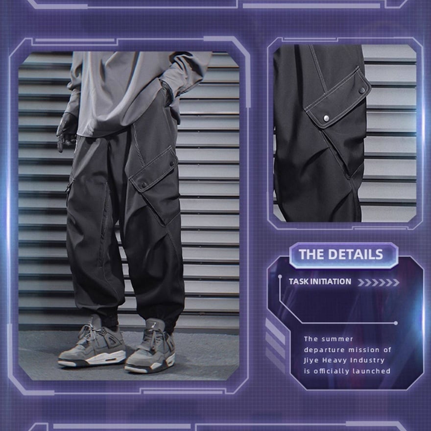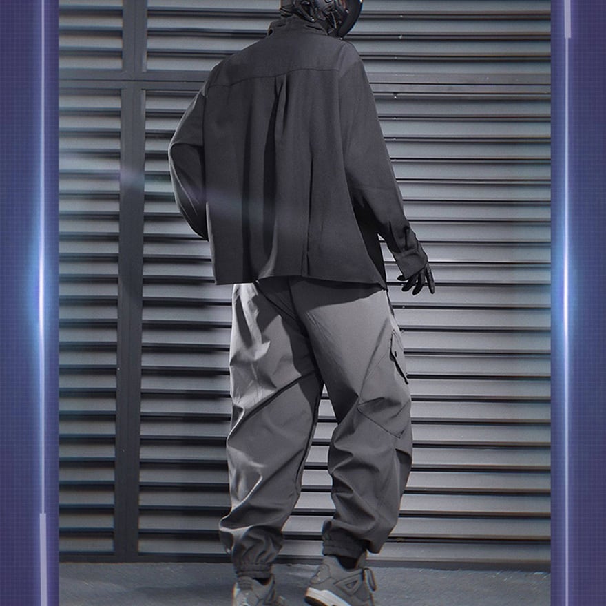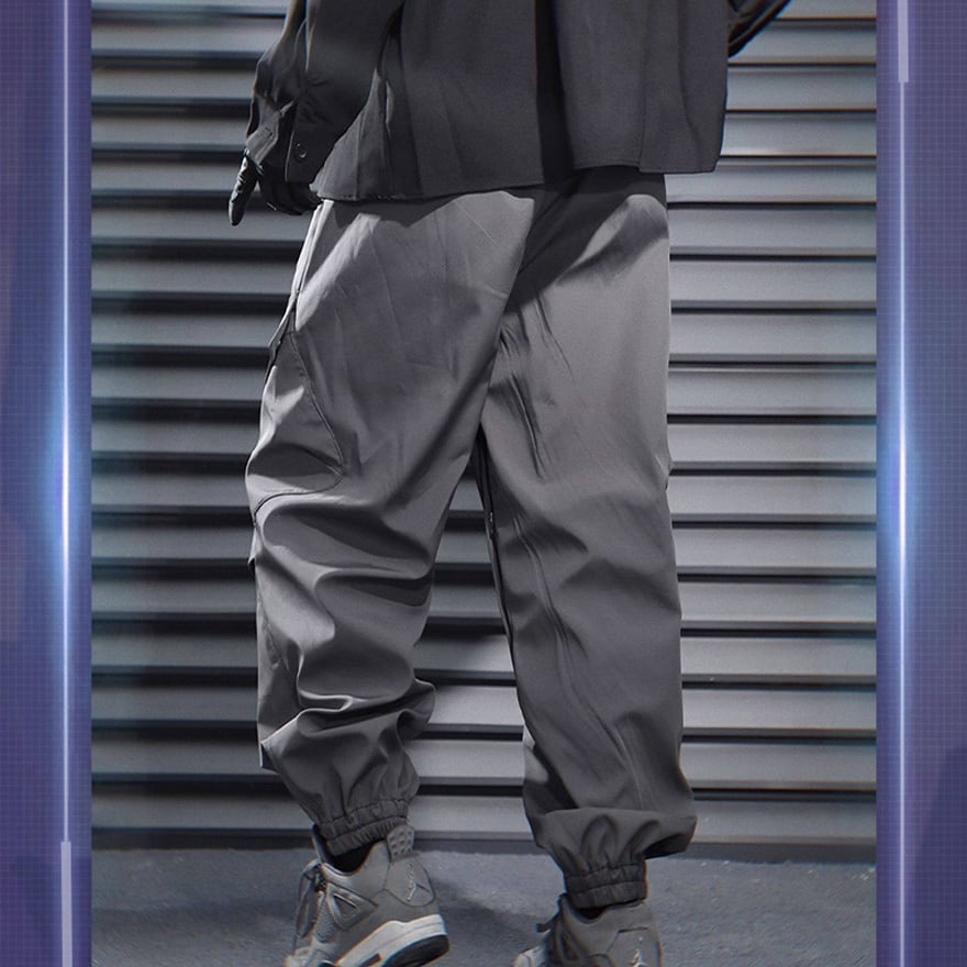 サイバーパンク風 テック系カーゴパンツ|ユーティリティポケット付き ジョガーパンツ(ブラック/グレー)|天使と悪魔