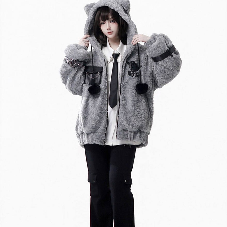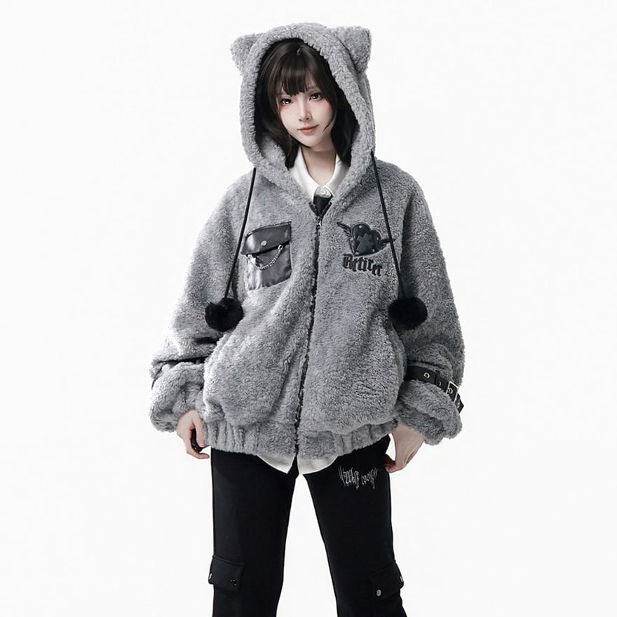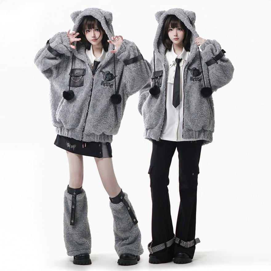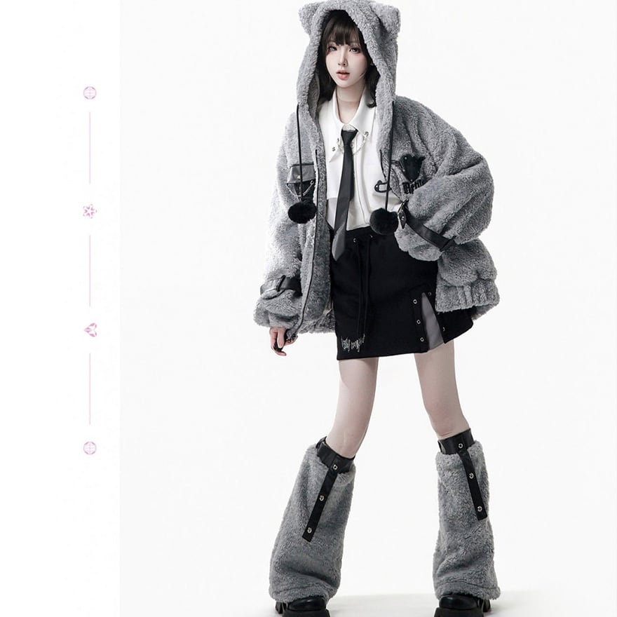 サブカル系ジャンルに属する、灰色のボア素材を使用した厚手のレッグウォーマーです。