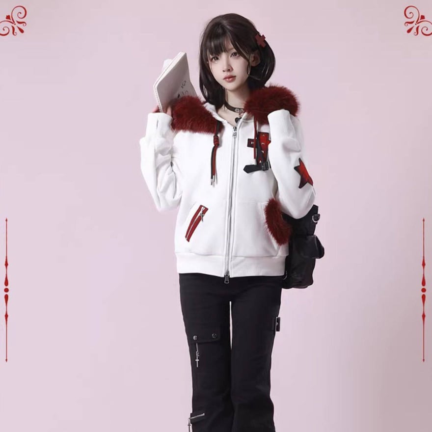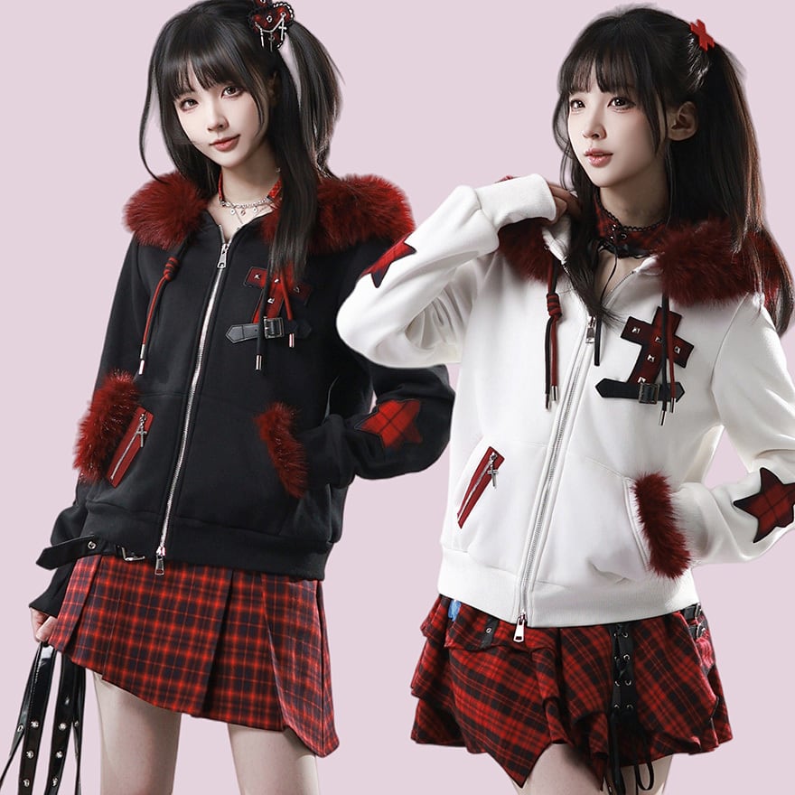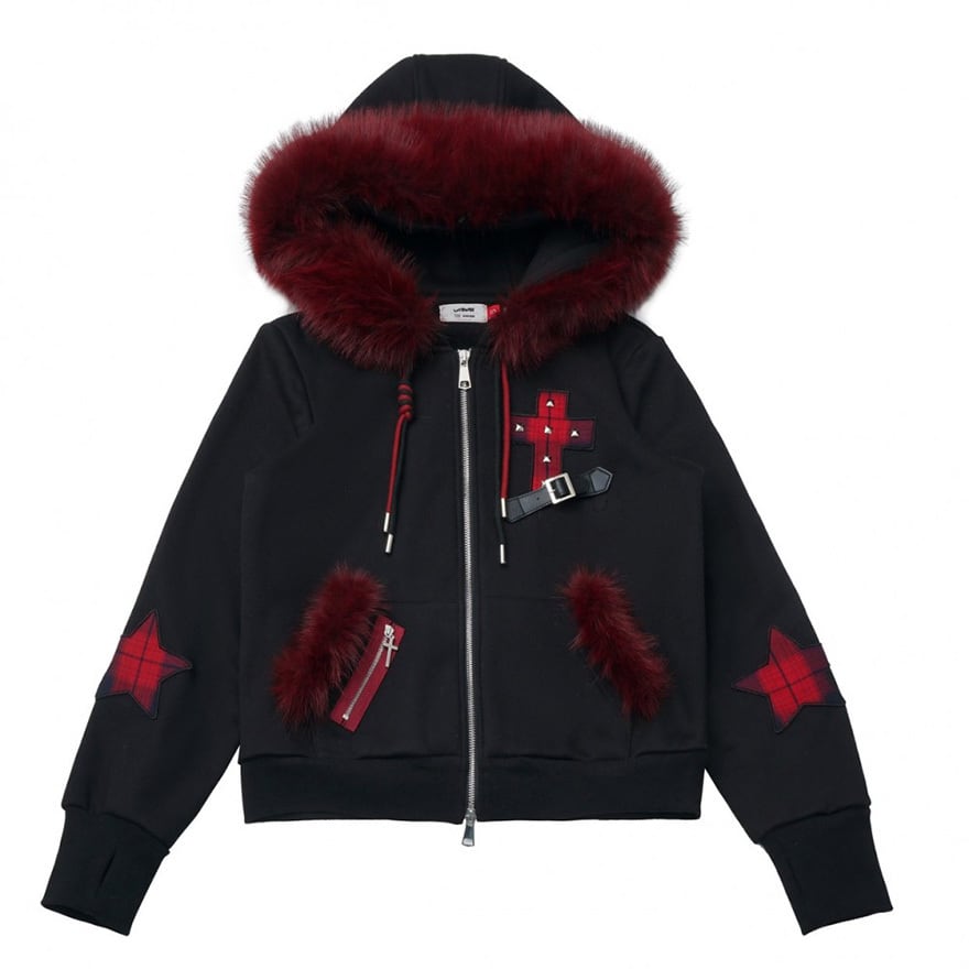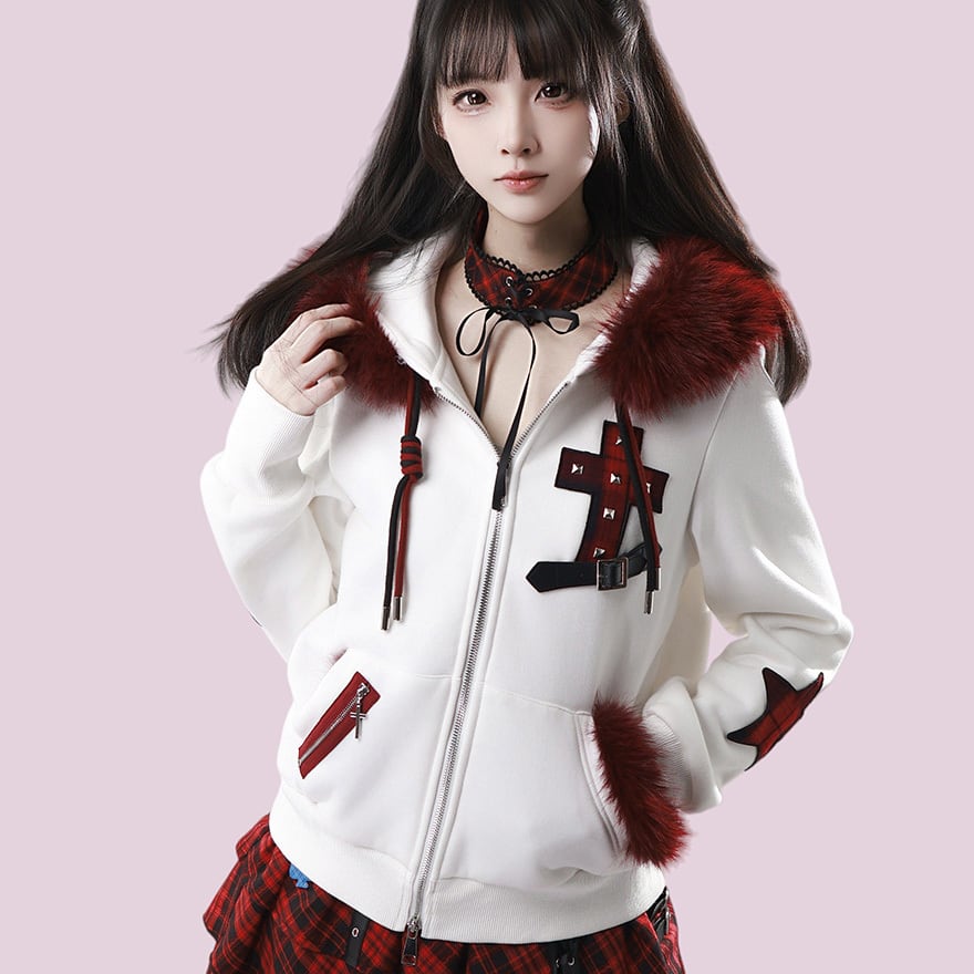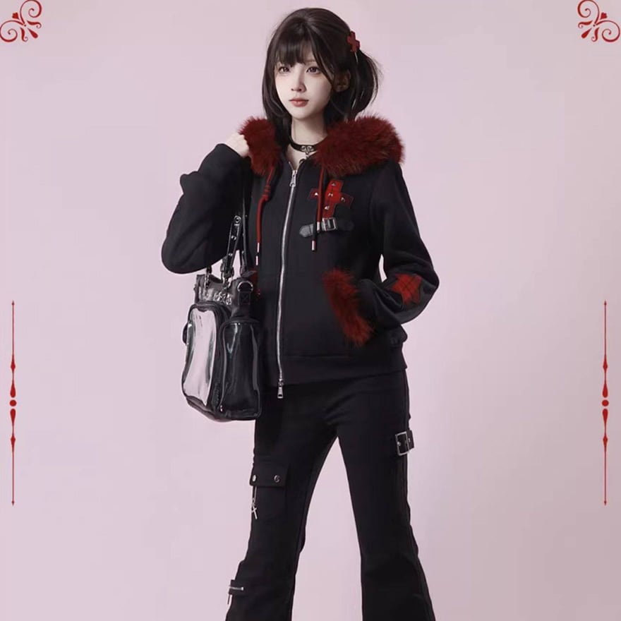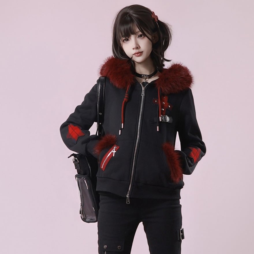赤ファー付きクロスモチーフ ジップアップパーカー|ゴシック×サブカル対応 ユニセックスアウター|天使と悪魔