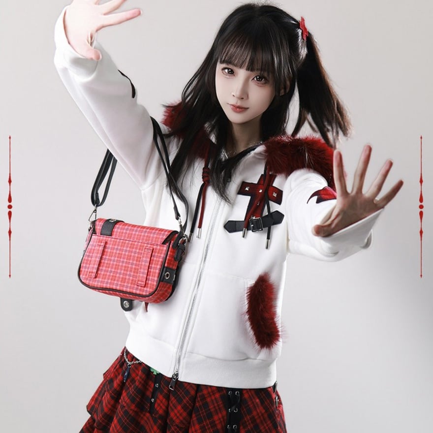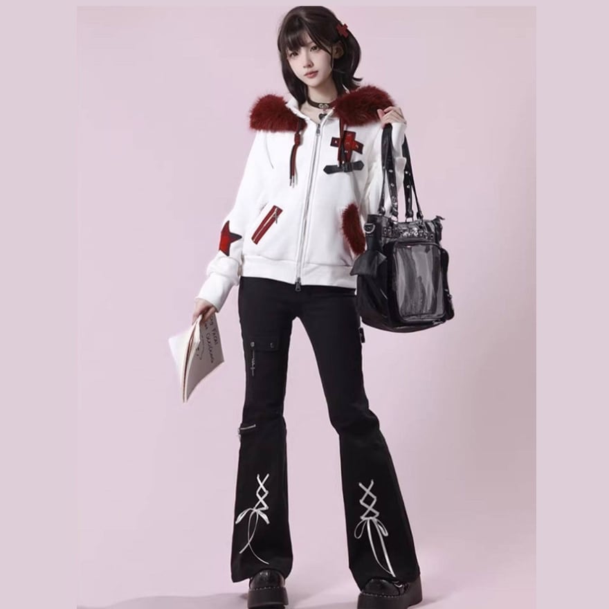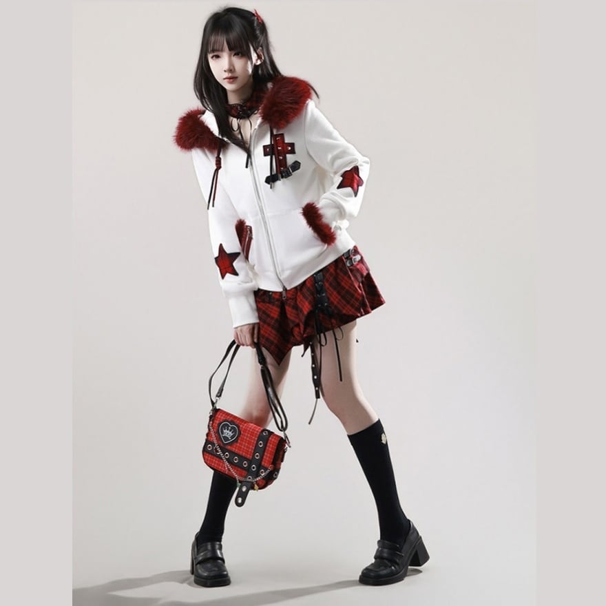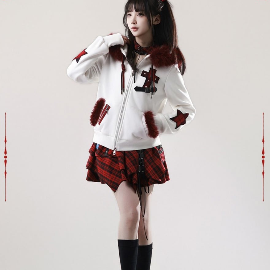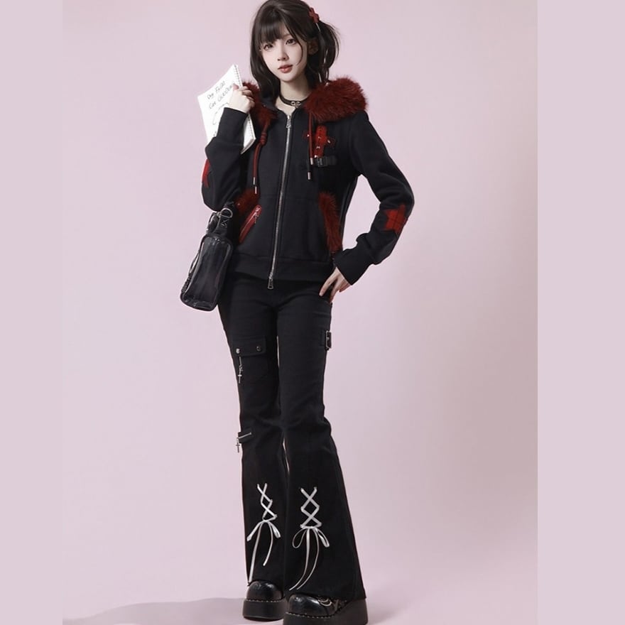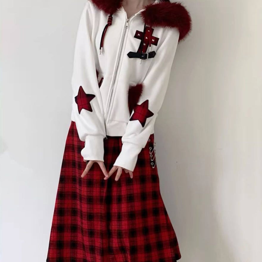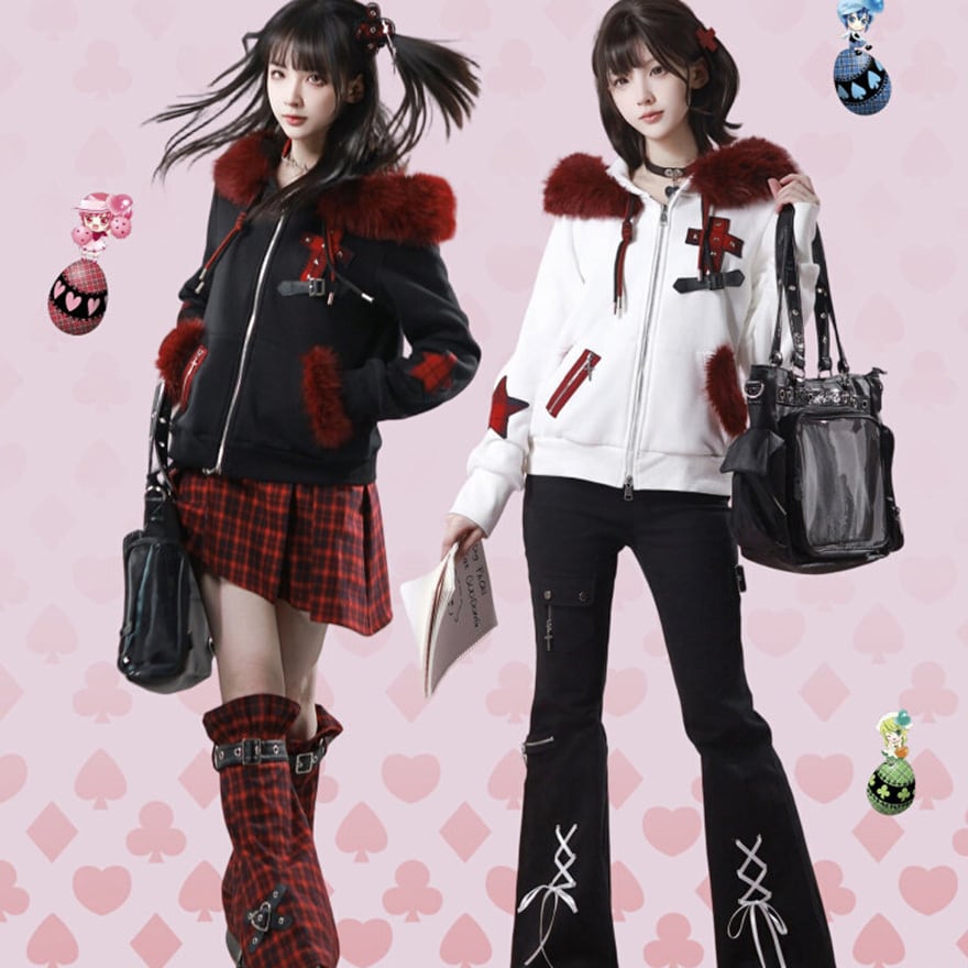 赤ファー付きクロスモチーフ ジップアップパーカー|ゴシック×サブカル対応 ユニセックスアウター|天使と悪魔