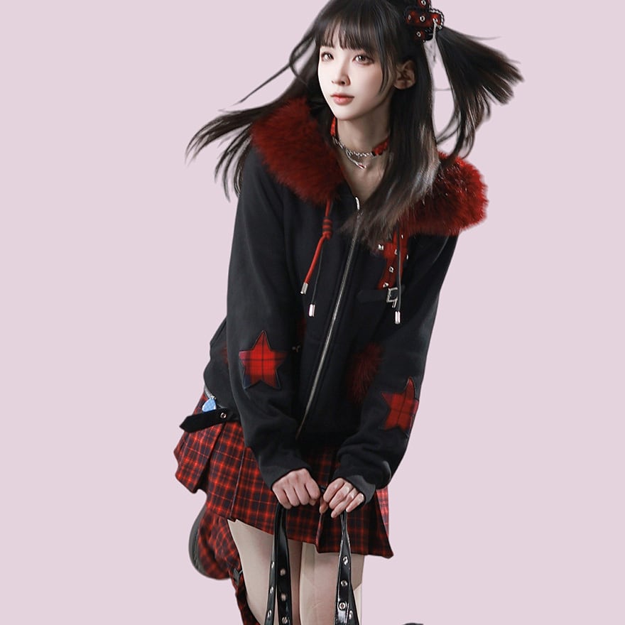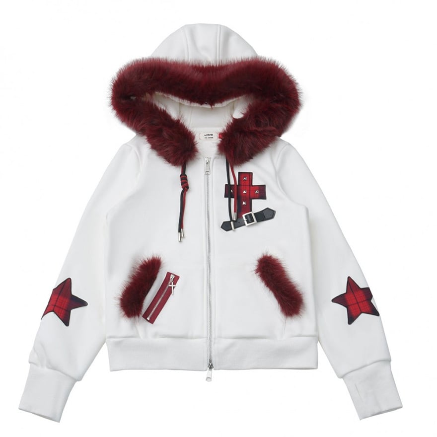 フード縁とポケット部分にボリュームのある濃赤色の毛皮風装飾をあしらい、胸元にはベルト付きの十字架ワッペン、袖には星型の格子柄パッチを配置しています。
