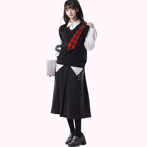 赤チェック/ブラック無地 ベルトデザイン Aラインスカート|地雷系・ゴシック・サブカル対応 ミモレ丈スカート|天使と悪魔