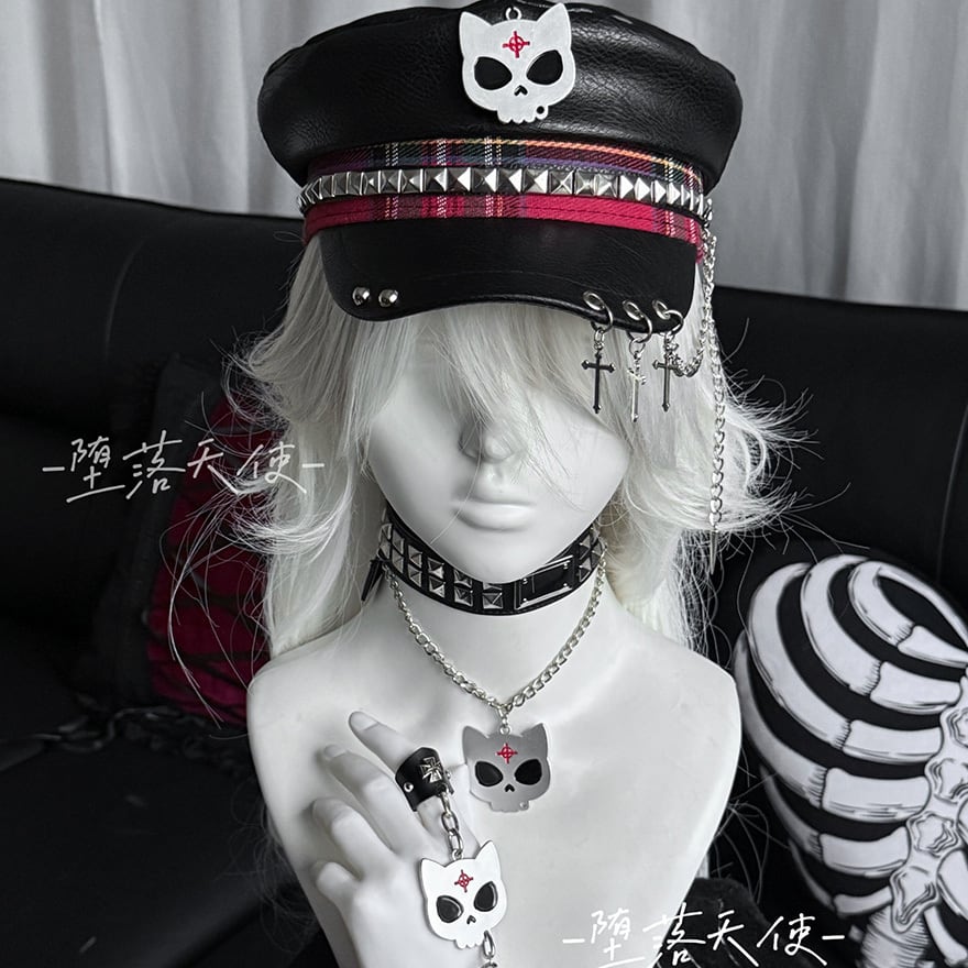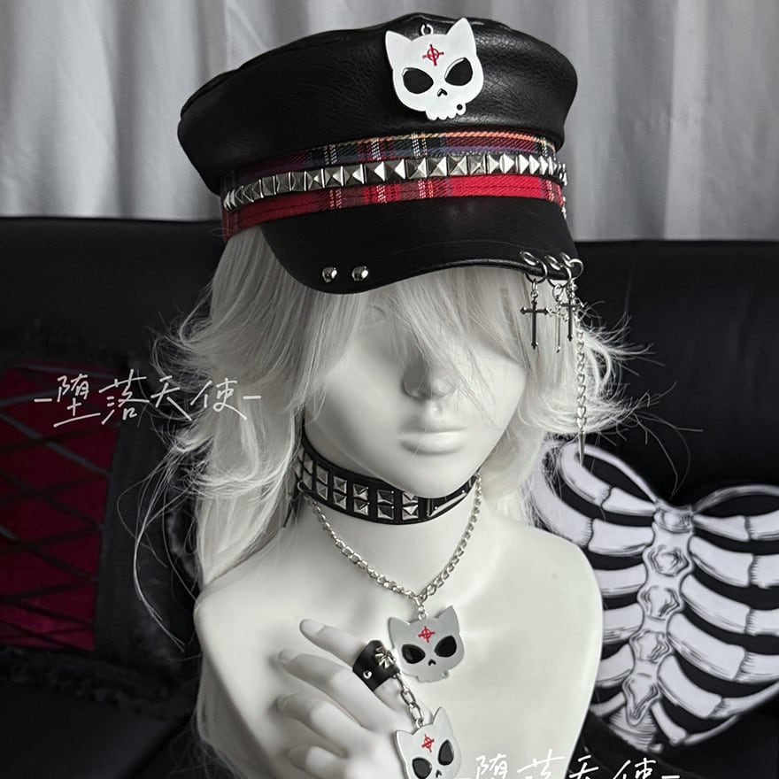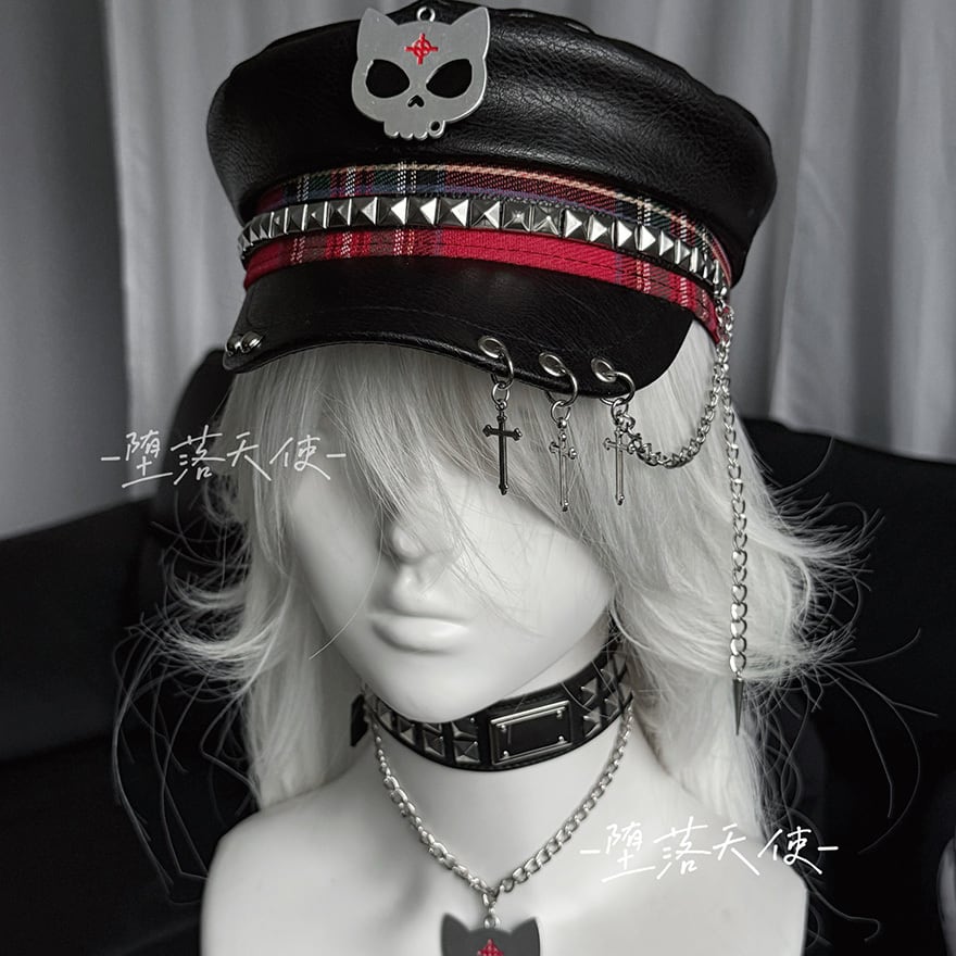 堕落天使パンク キャップ(帽子)|スカルエンブレム×赤チェック帯×スタッズ×クロスチェーンチャーム|天使と悪魔