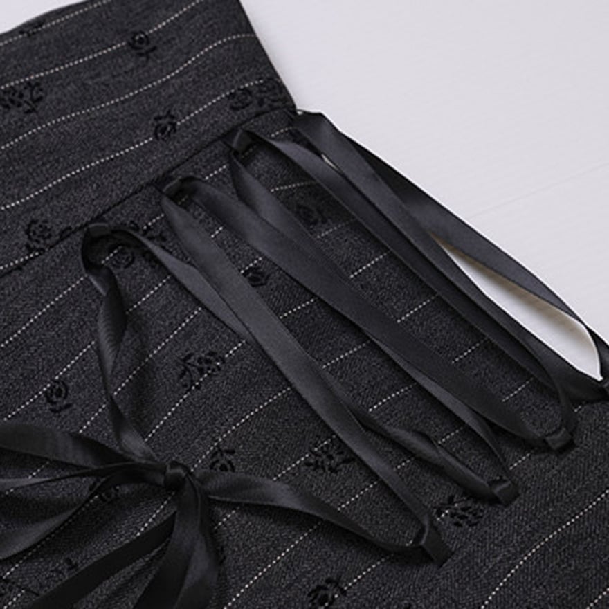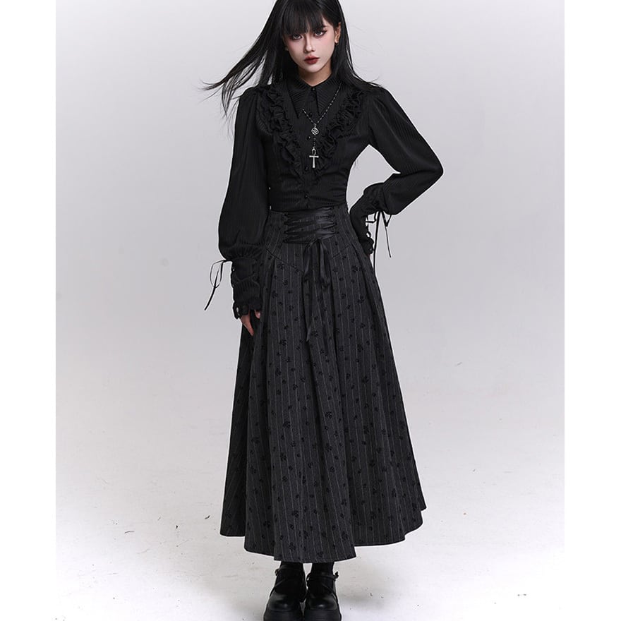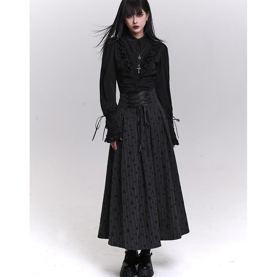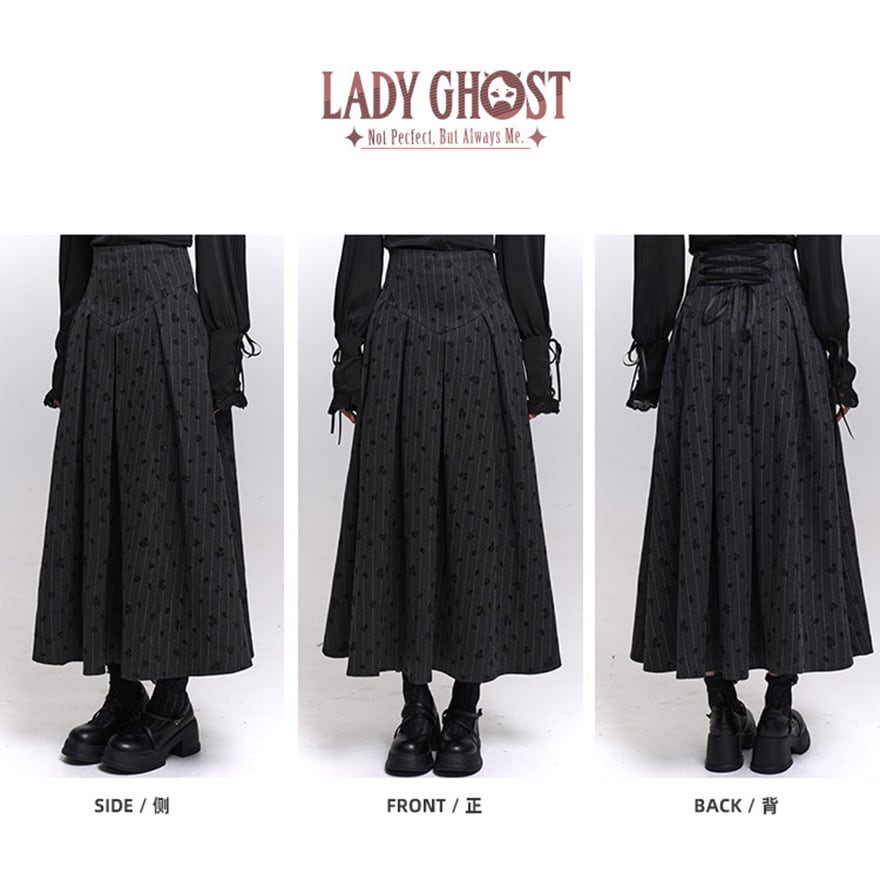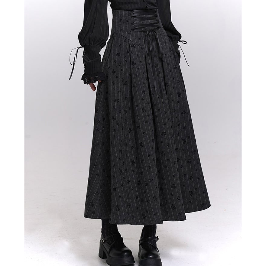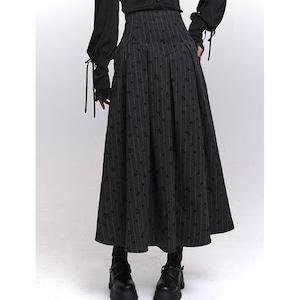 ゴシック調 編み上げウエスト ロングスカート|ストライプ×小紋柄・フレアシルエット|天使と悪魔