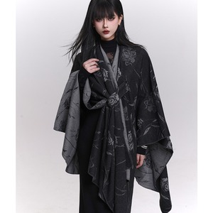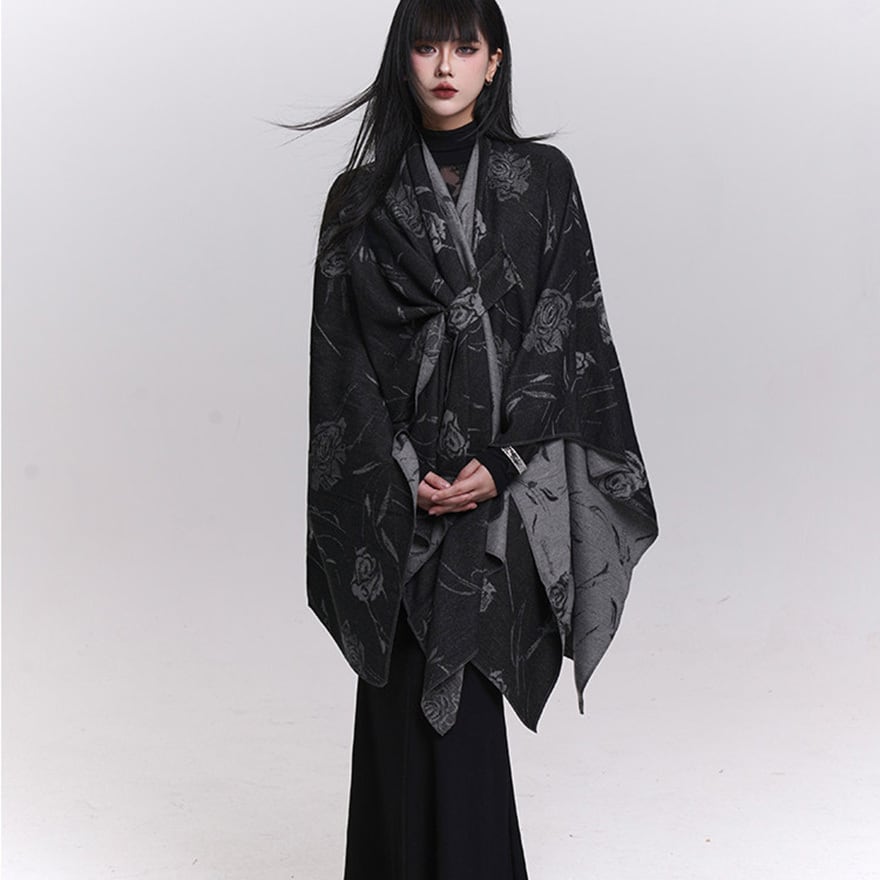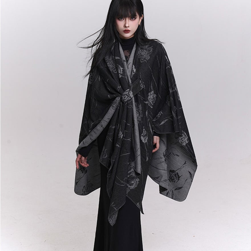 ゴシックローズ柄 大判ショール風ポンチョ|重ね着対応・ブラック系ゴシックストール|天使と悪魔